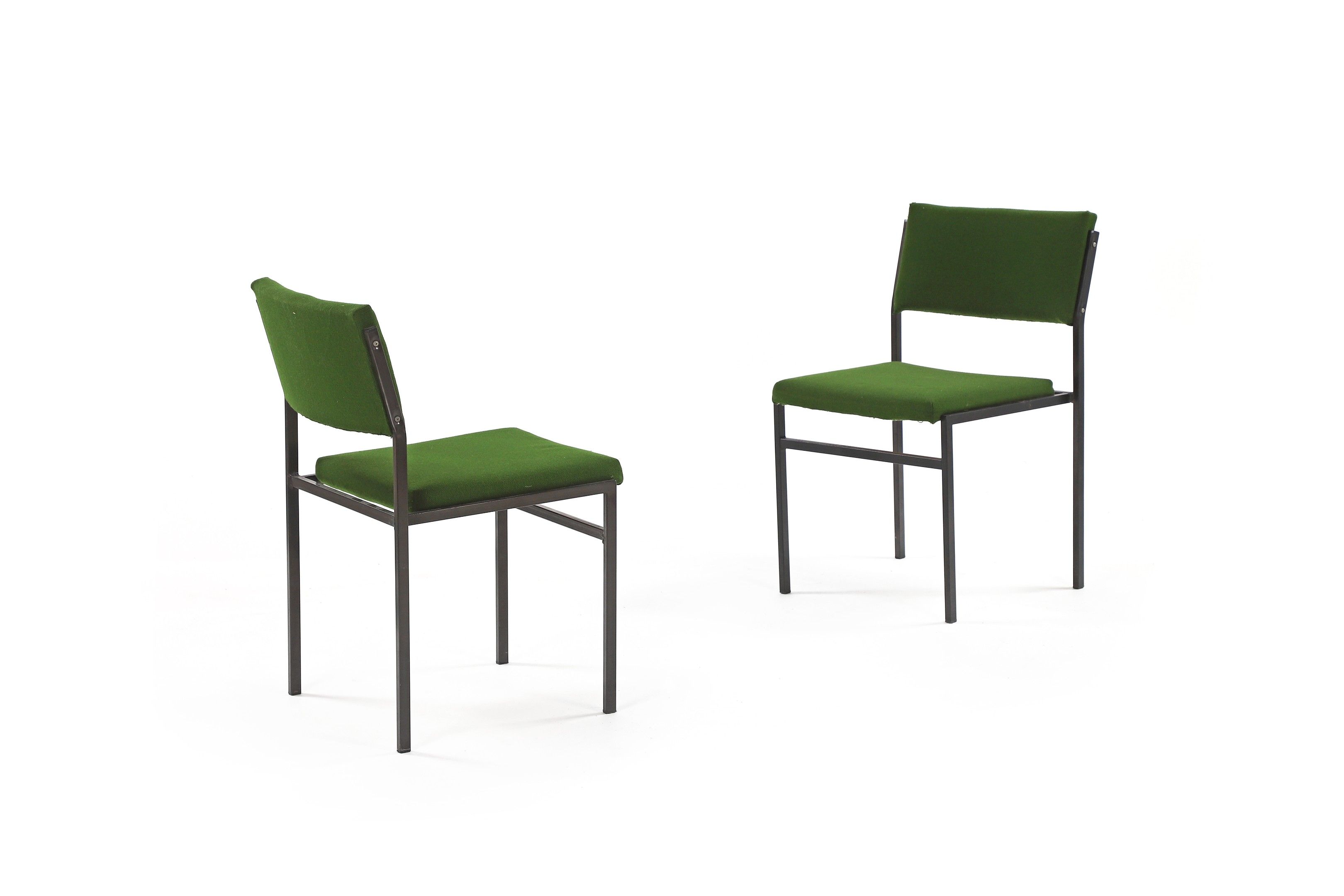 A pair of chairs, c. 1960, grey lacquered metal structure, re-filled with foam, original green woolen upholstery.