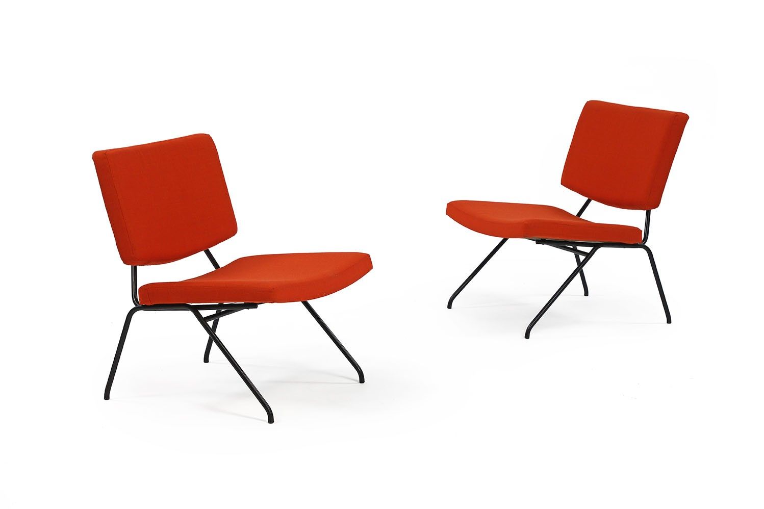 A pair of 'CM190' armchairs, model designed c. 1960, black lacquered metal structure, seat and backrest cushions later upholstered in orange wool.