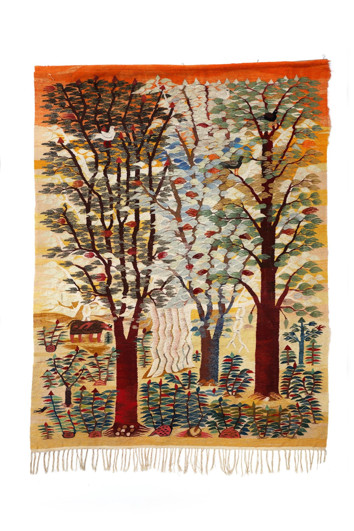 In polychrome wool, decorated with trees, birds and stylised animals on an orange background.