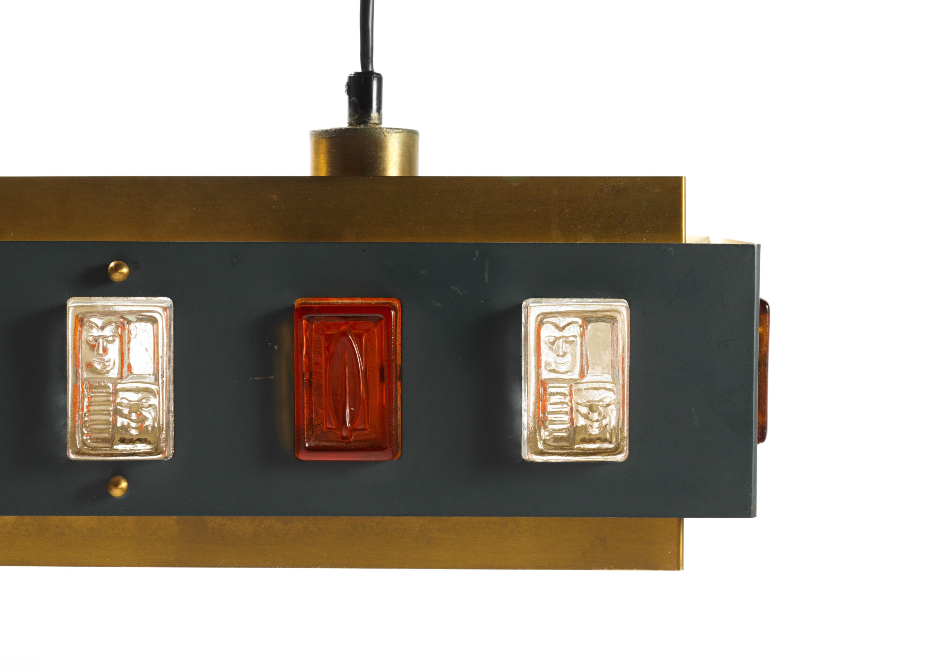 In brass and lacquered metal, decorated with a frieze of rectangular cabochons in moulded amber or translucent glass.
