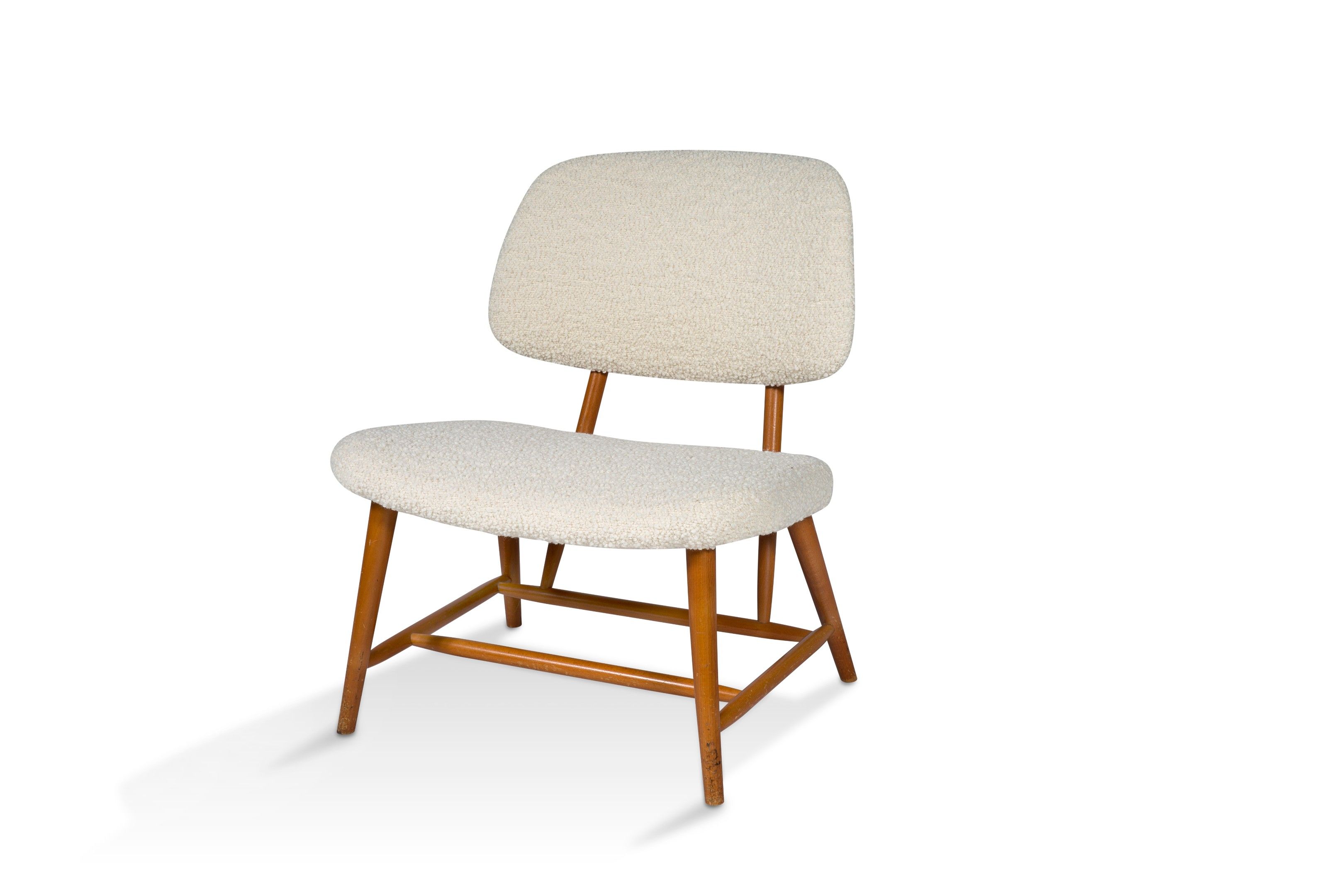Oak frame, seat and back covered in white bouclette.