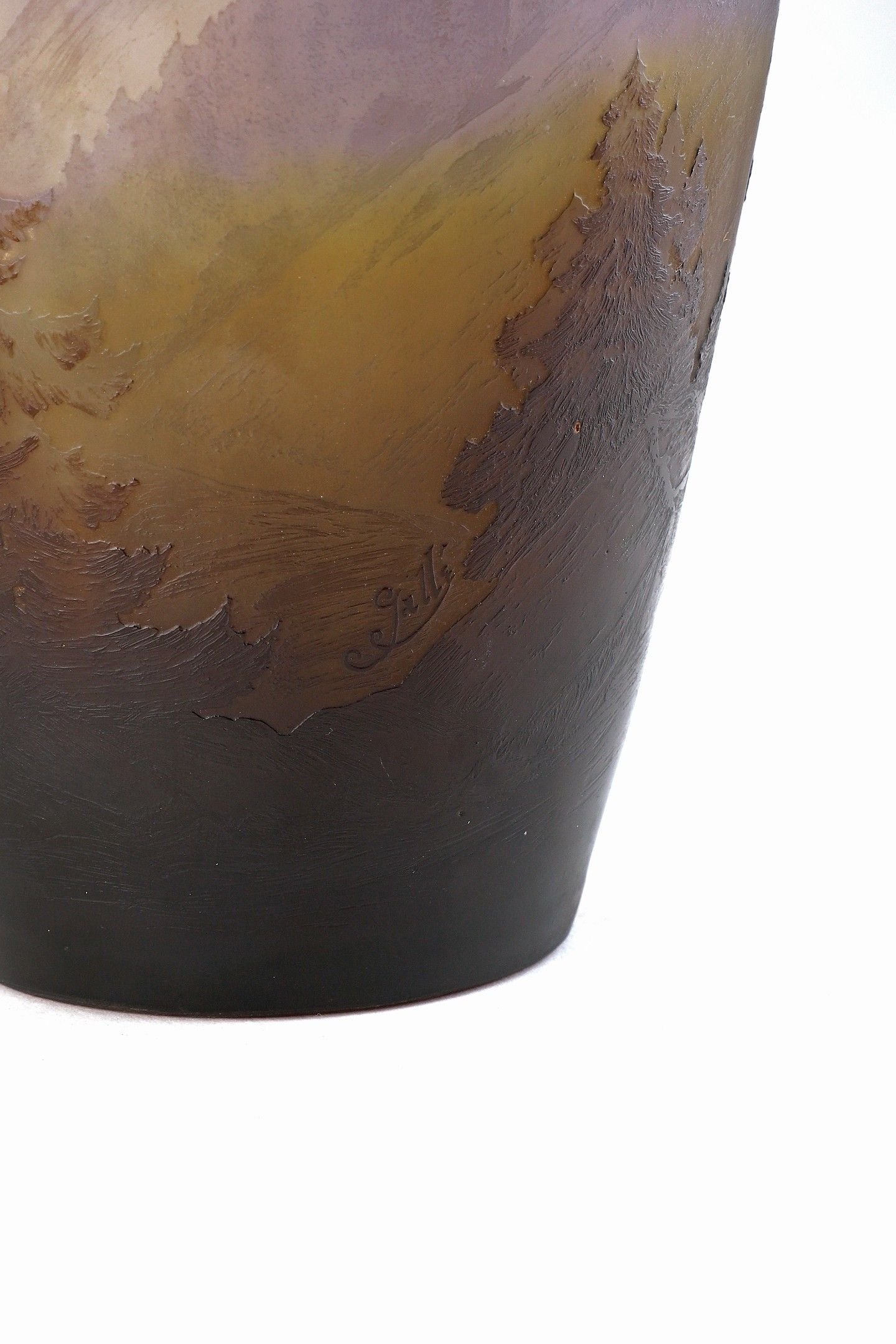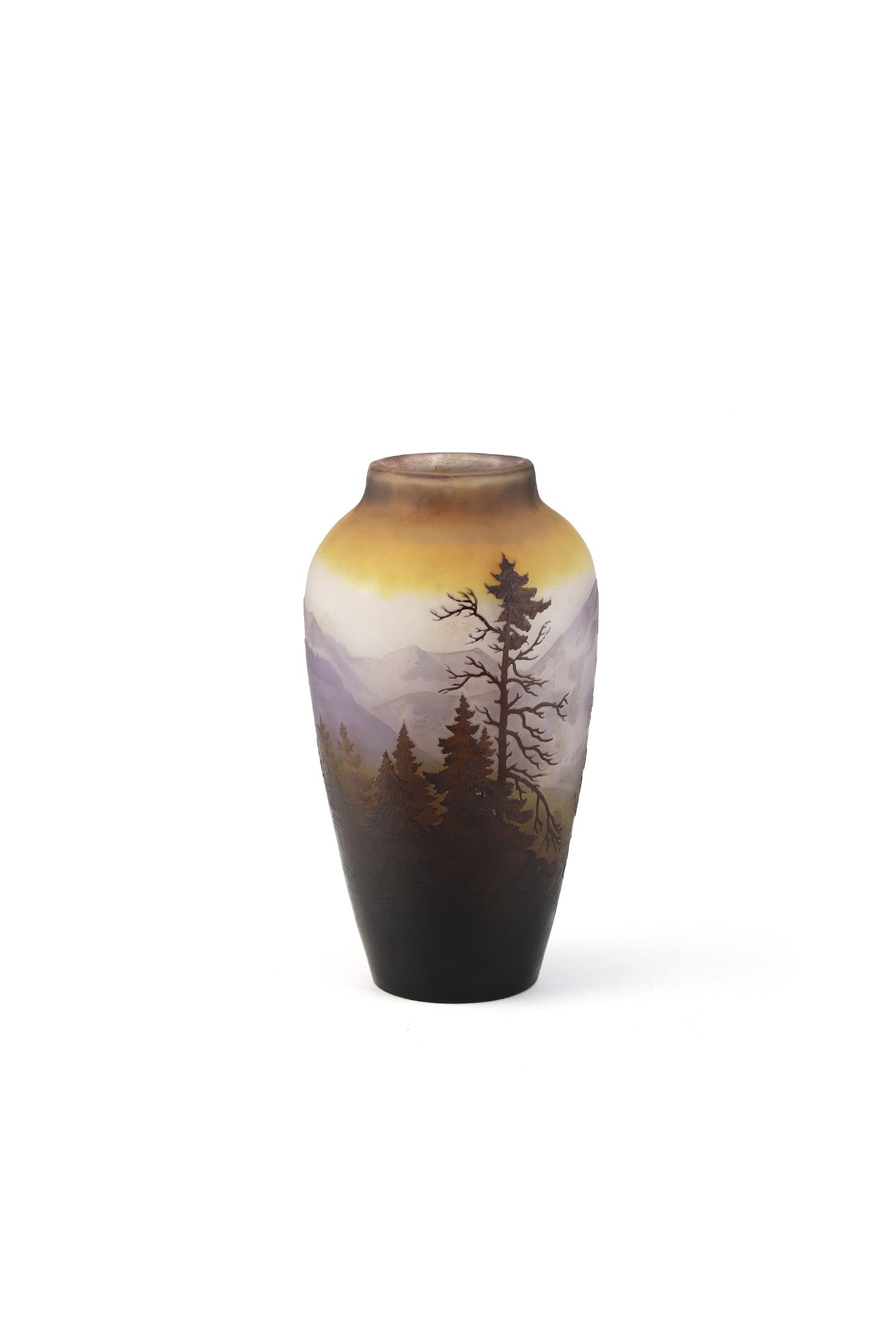 Brown and violet multi-layered glass on a satin and yellow ground, with acid-etched decoration of a mountainous landscape.