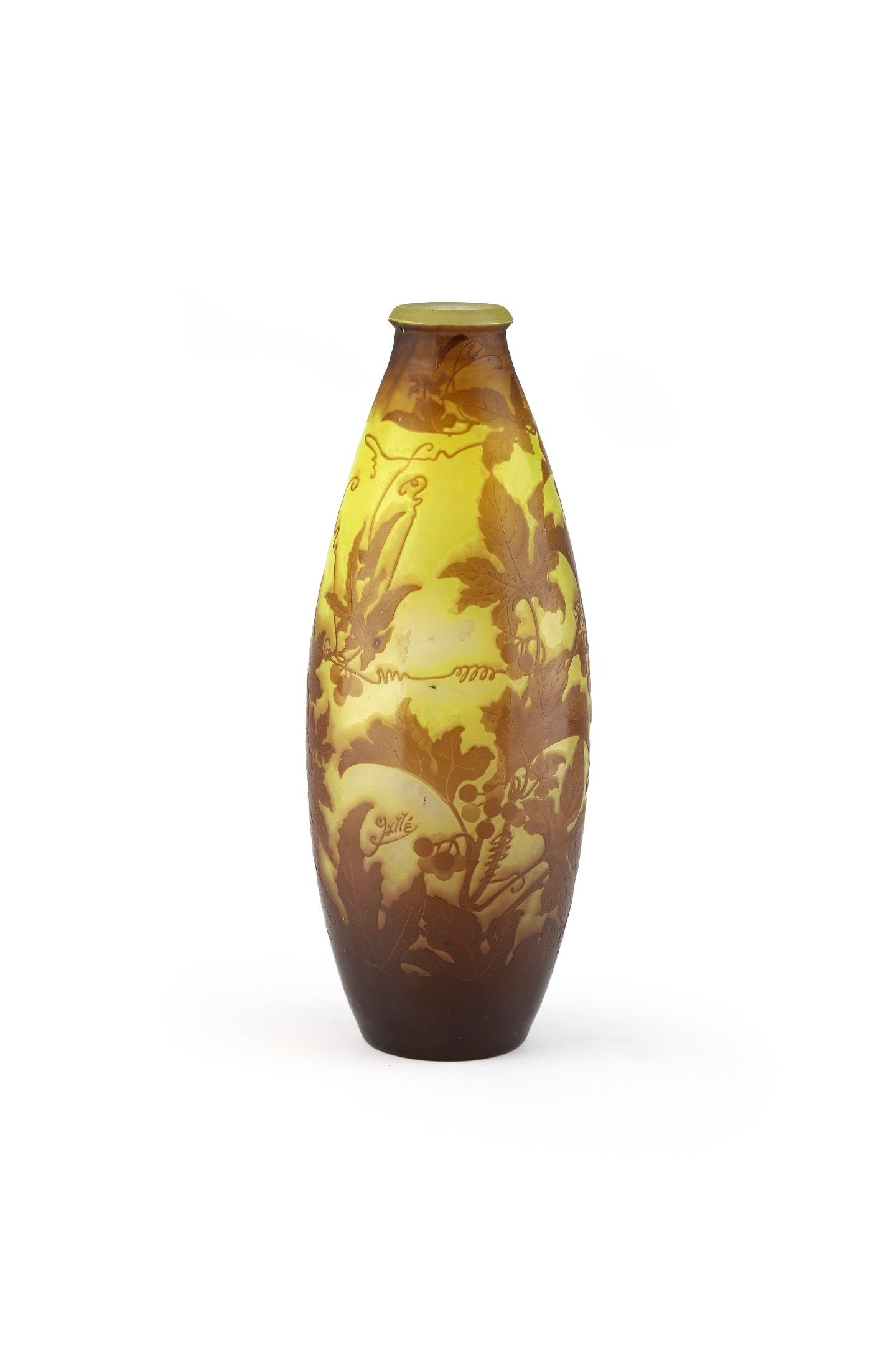 In brown multi-layered glass on a yellow ground, with acid-etched decoration of vine shoots.