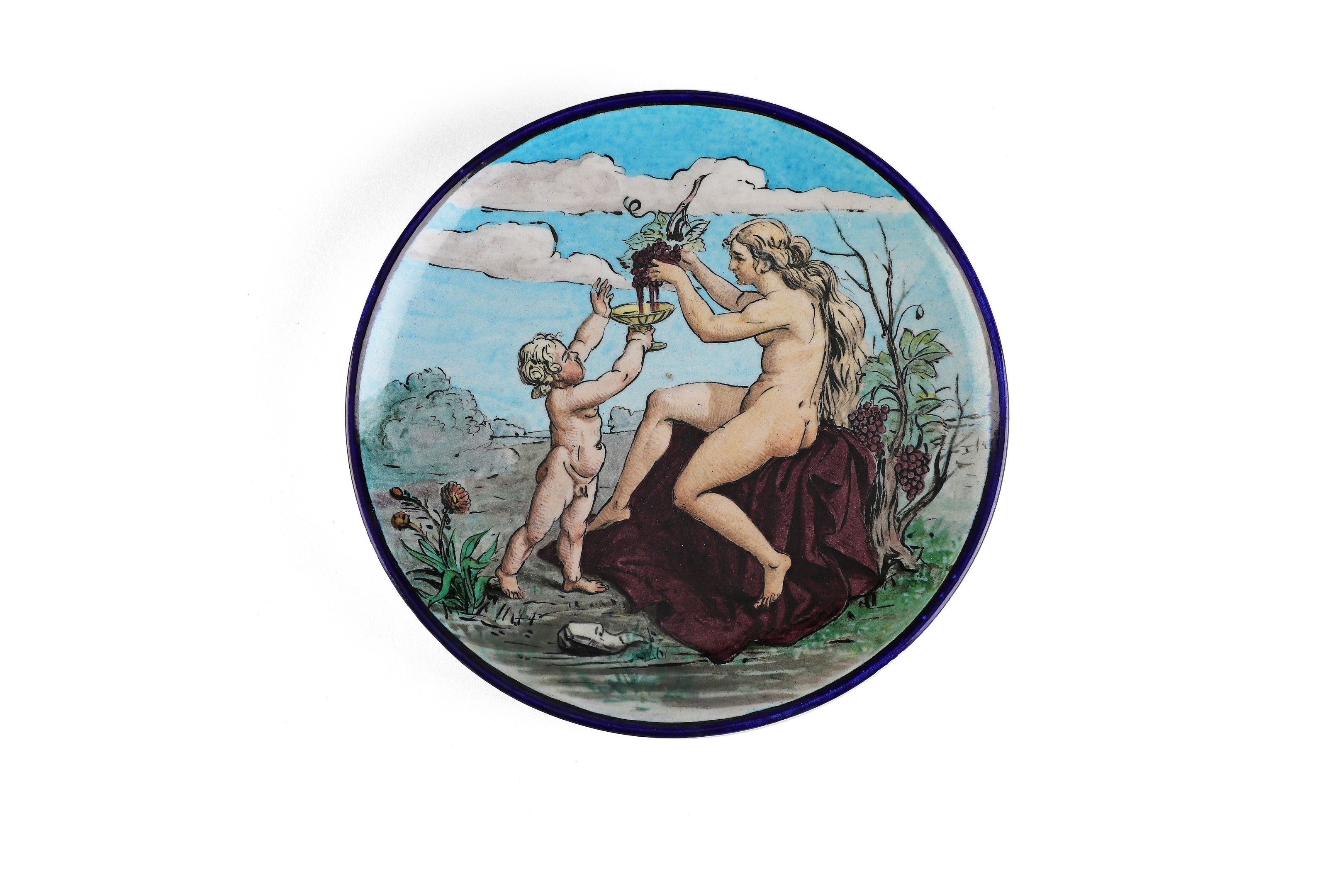 Enamelled earthenware, with polychrome decoration of a scene in the taste of the Renaissance with the Bacchante and the young bacchant.