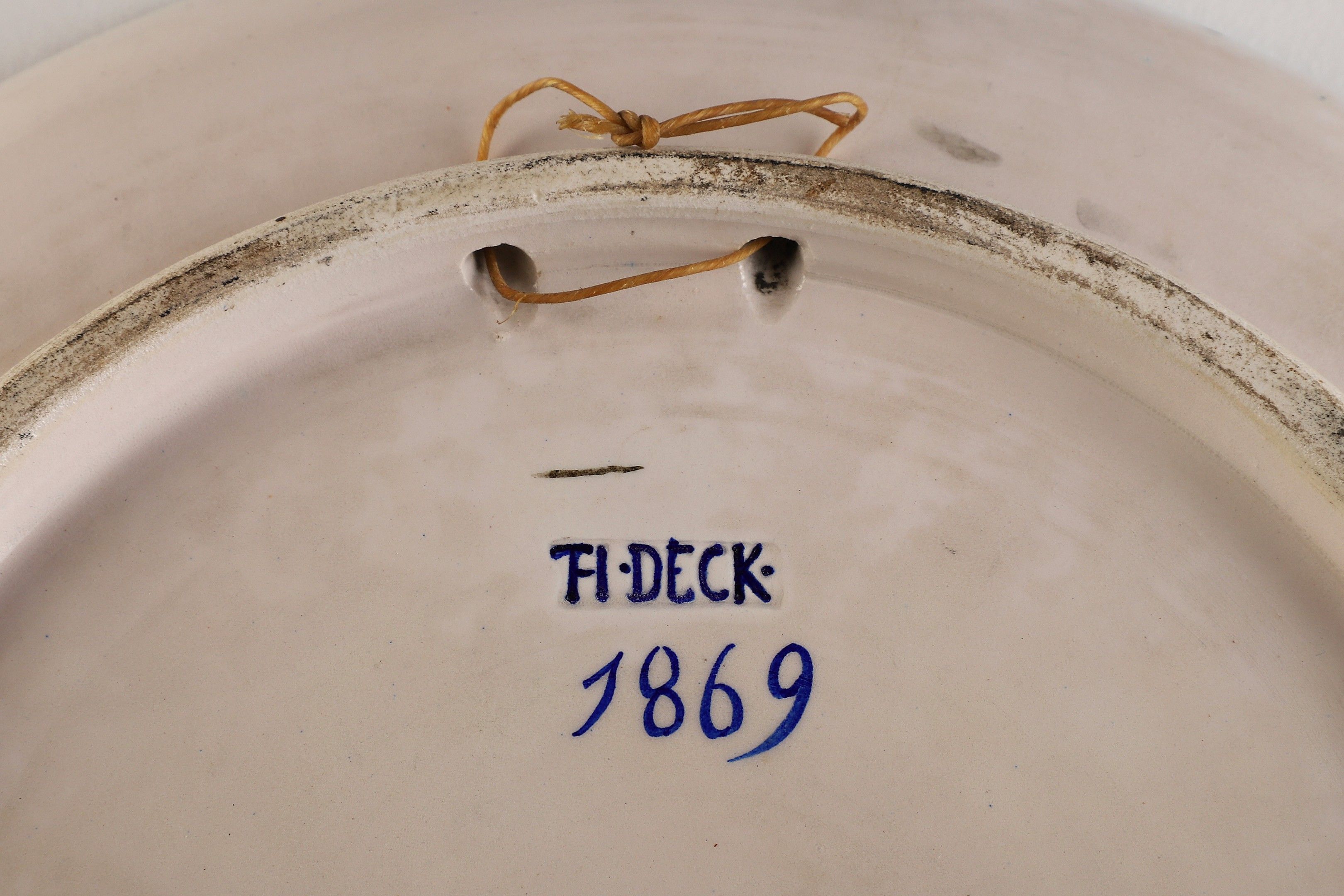 A plate, 1869, enamelled earthenware. Signed and dated.