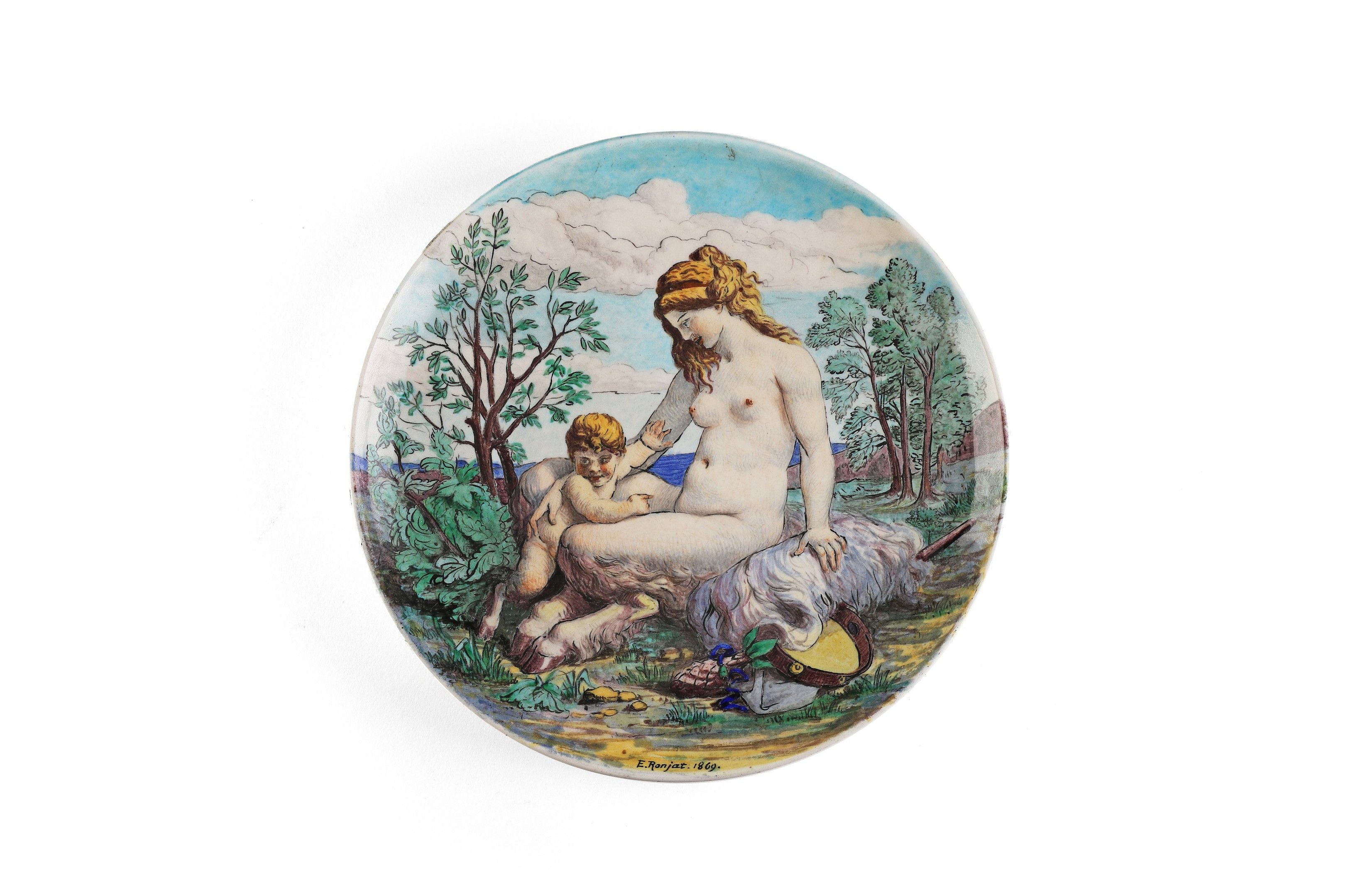 Enamelled earthenware, with polychrome decoration of a Renaissance scene of a young woman and a young faun, inscribed 'E. Ronjat 1869' at the bottom.