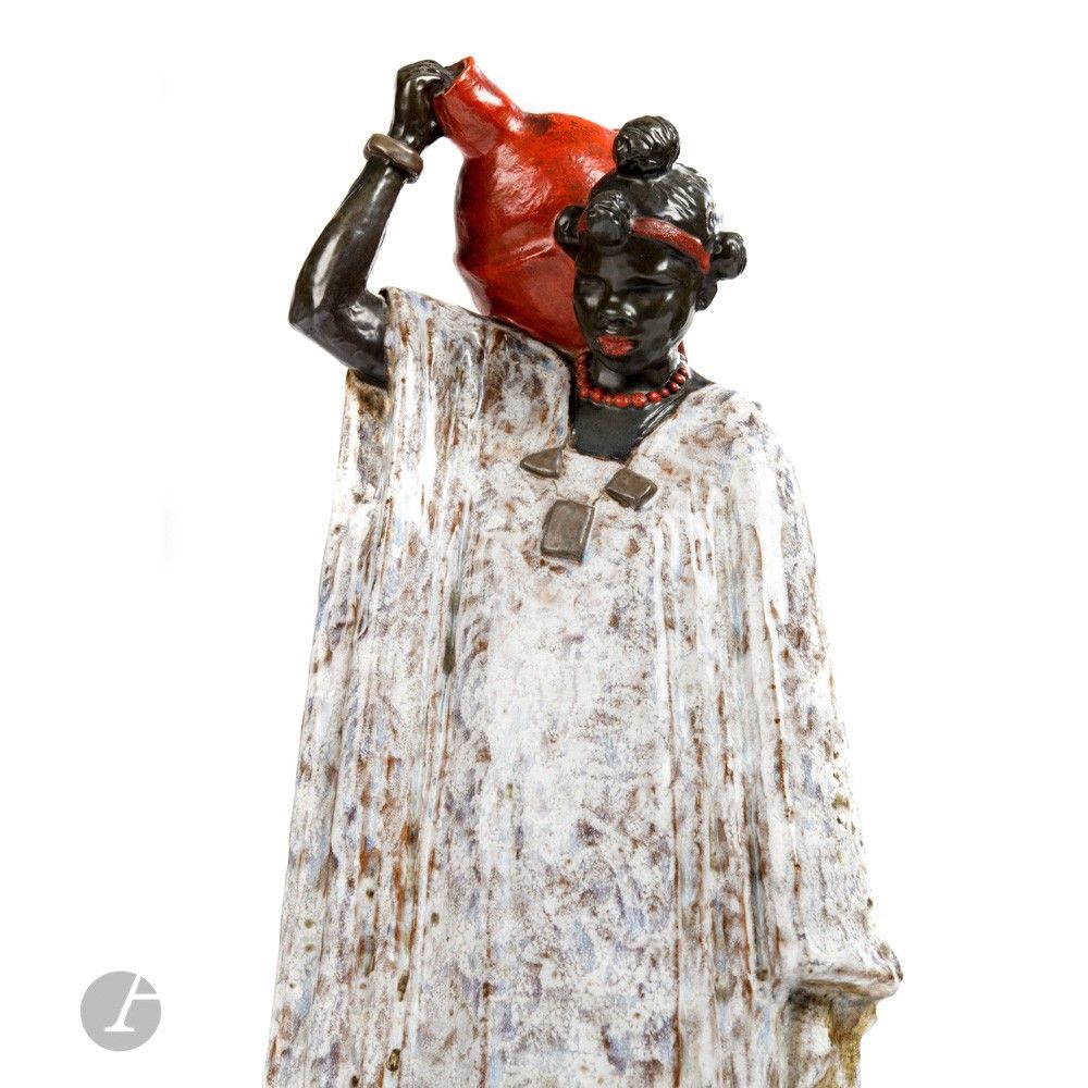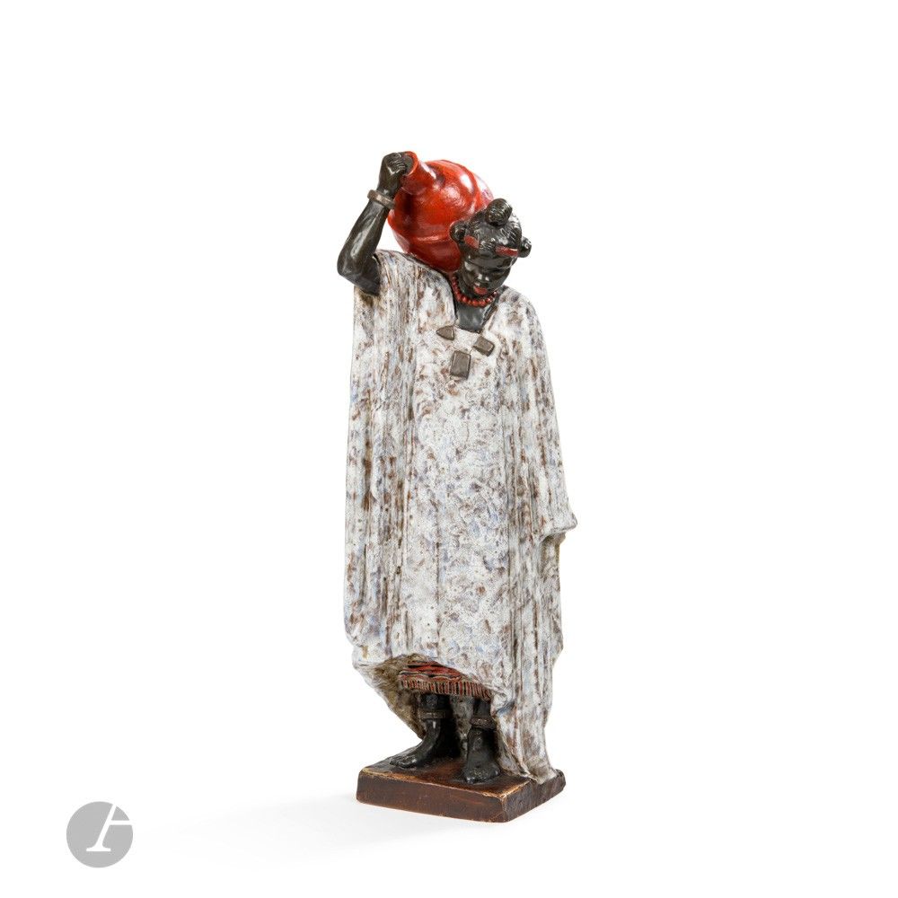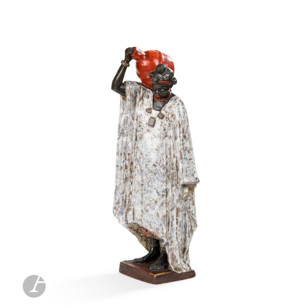 Femme porteuse d'eau Songoï, also known as La porteuse d'eau de Tombouctou, or Négresse à l'amphore, the model designed around [1925], the plaster of the model presented at the Galerie d'Art contemporain (Paris) in 1926, the edition in soft stoneware of only 7 copies made between 1930 and 1933, the only proof in polychrome enamelled soft stoneware known to this day.