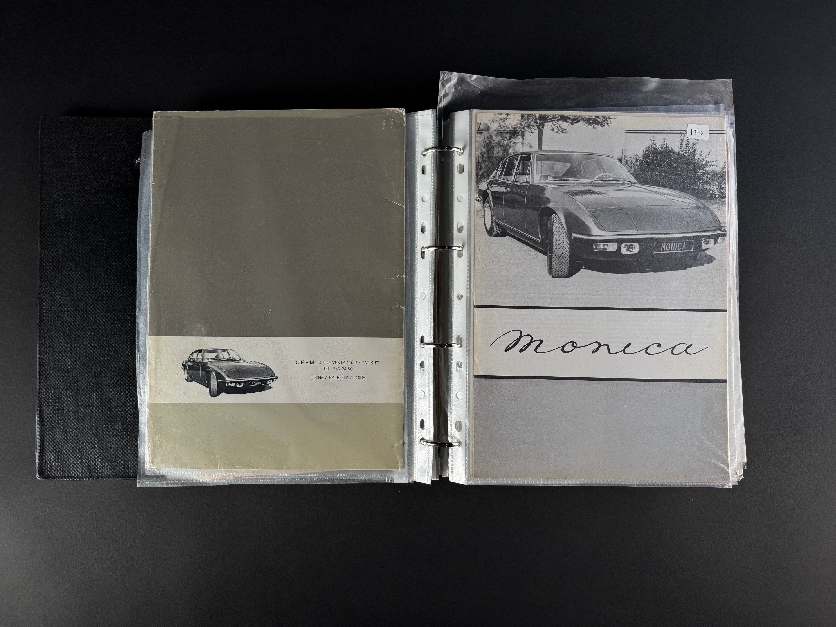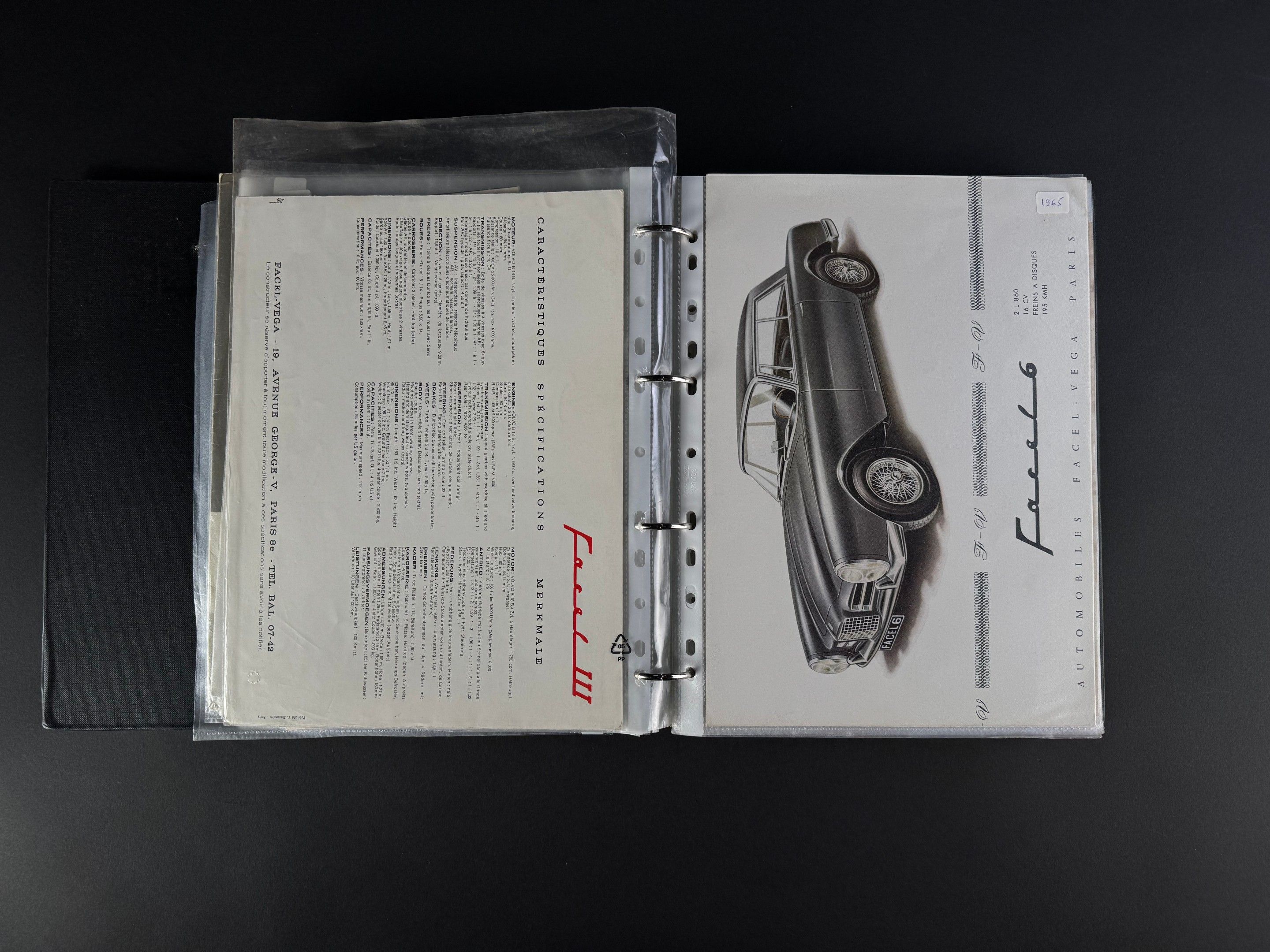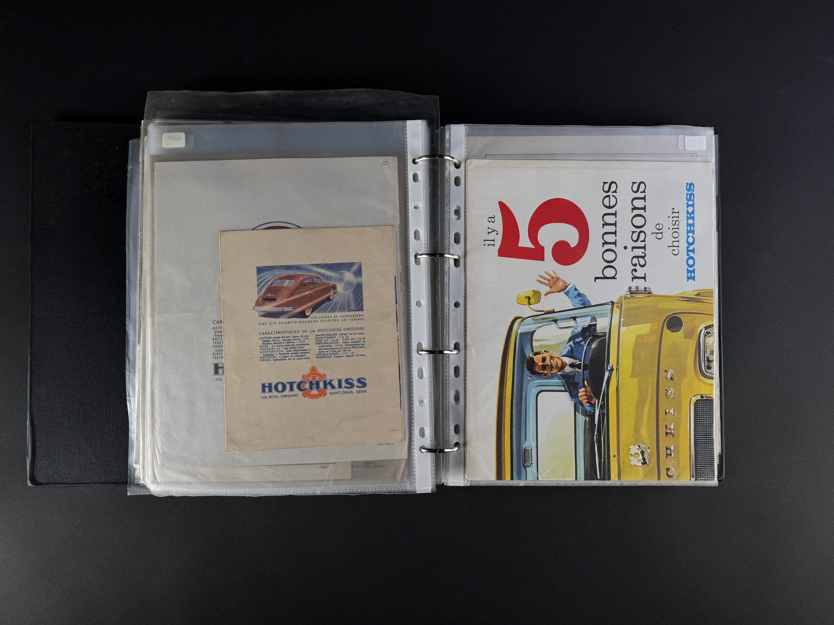 A documentation folder containing around 97 advertisements and leaflets from the following marques: BUARD, BUGATTI, CG, DELAGE, DELAHAYE, FACEL-VEGA, FLOIRAT, GALY, GORDINI, HOMMELL, HOTCHKISS, ISETTA, LAMBERT, LICORNE, MATHIS, MOCHET, MONICA, ROSENGART, SALMSON, SIMCA, TALBOT, VELOCAR, VESPA.
