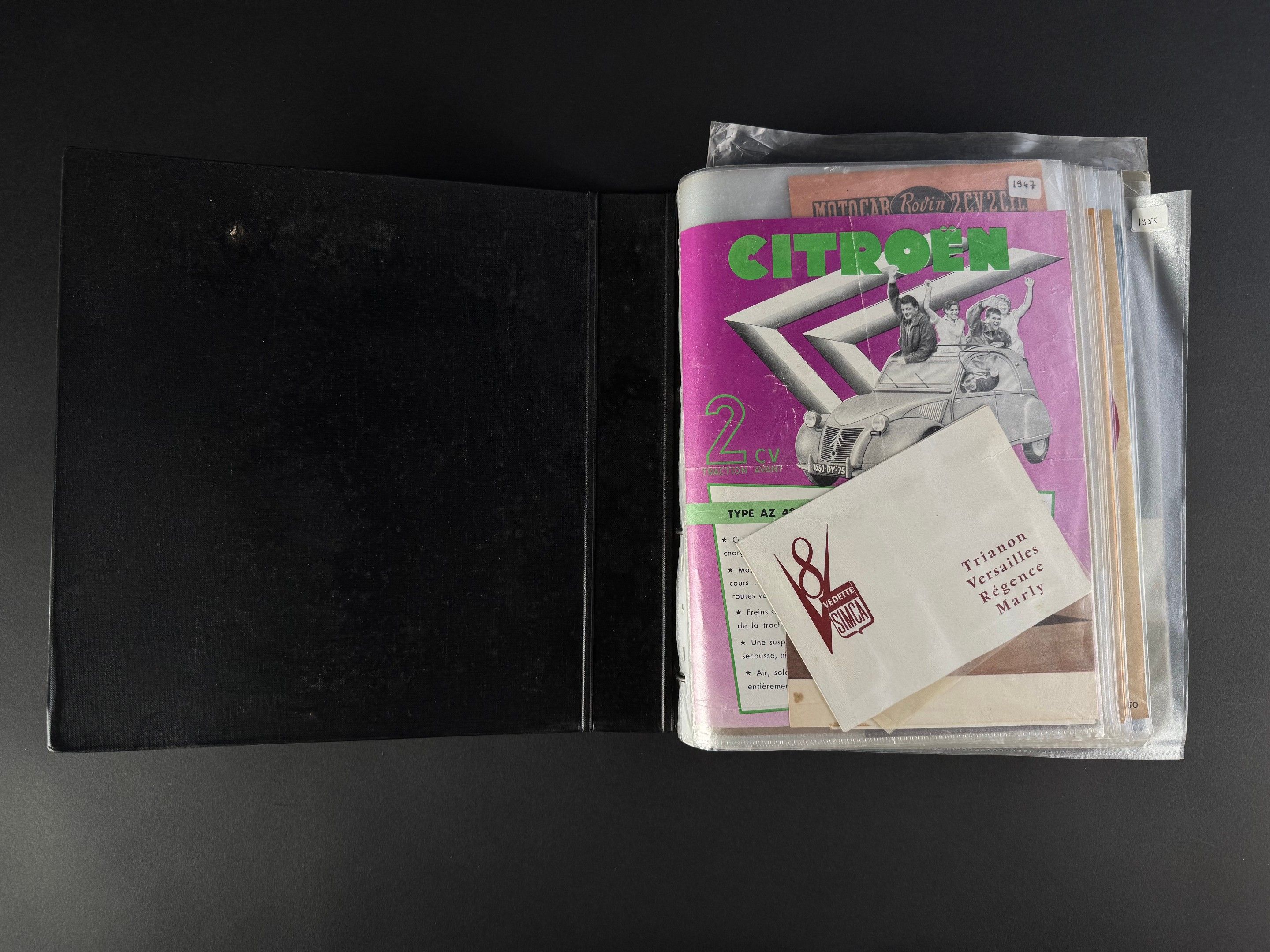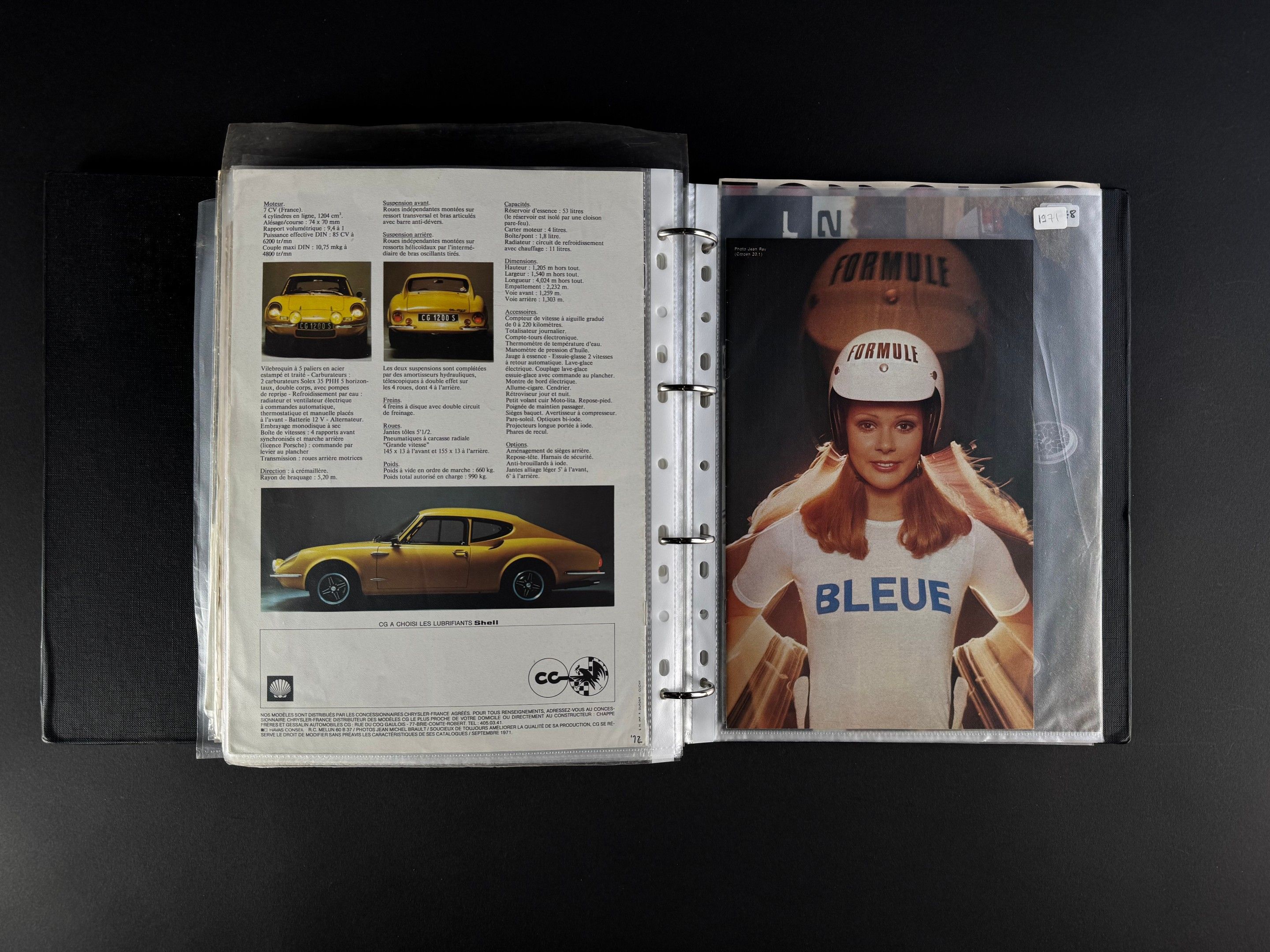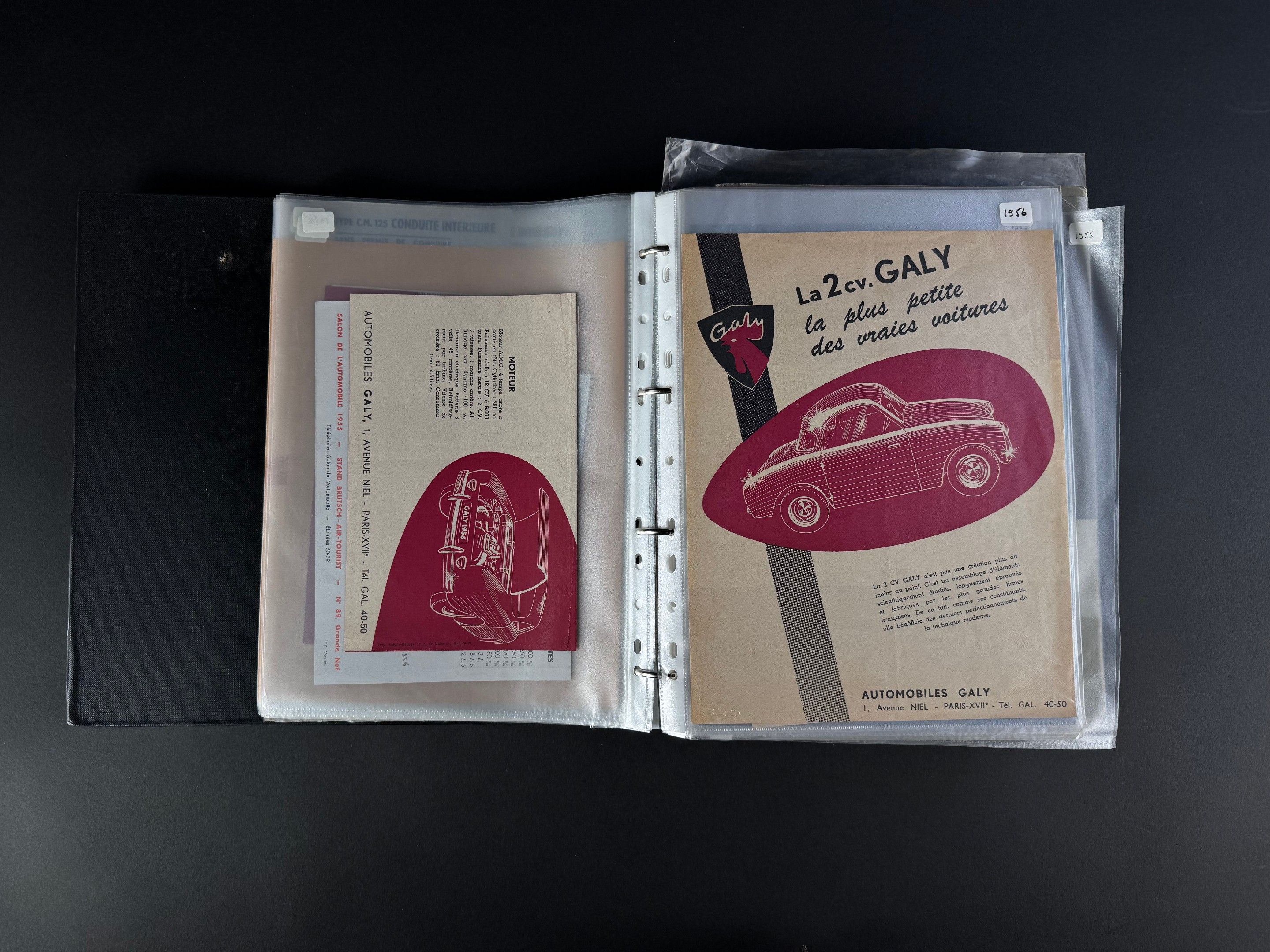 A documentation folder containing around 97 advertisements and leaflets from the following marques: BUARD, BUGATTI, CG, DELAGE, DELAHAYE, FACEL-VEGA, FLOIRAT, GALY, GORDINI, HOMMELL, HOTCHKISS, ISETTA, LAMBERT, LICORNE, MATHIS, MOCHET, MONICA, ROSENGART, SALMSON, SIMCA, TALBOT, VELOCAR, VESPA.