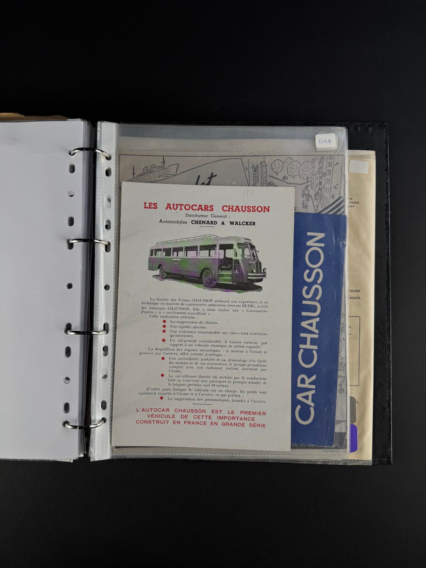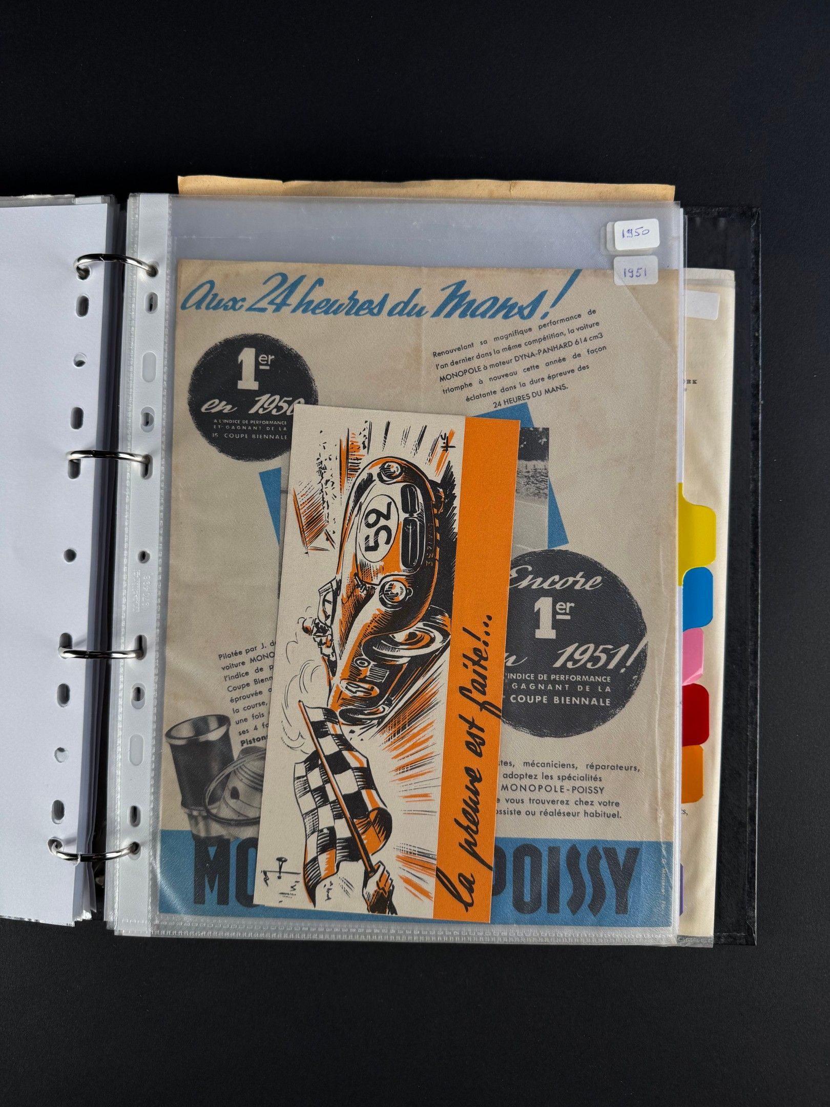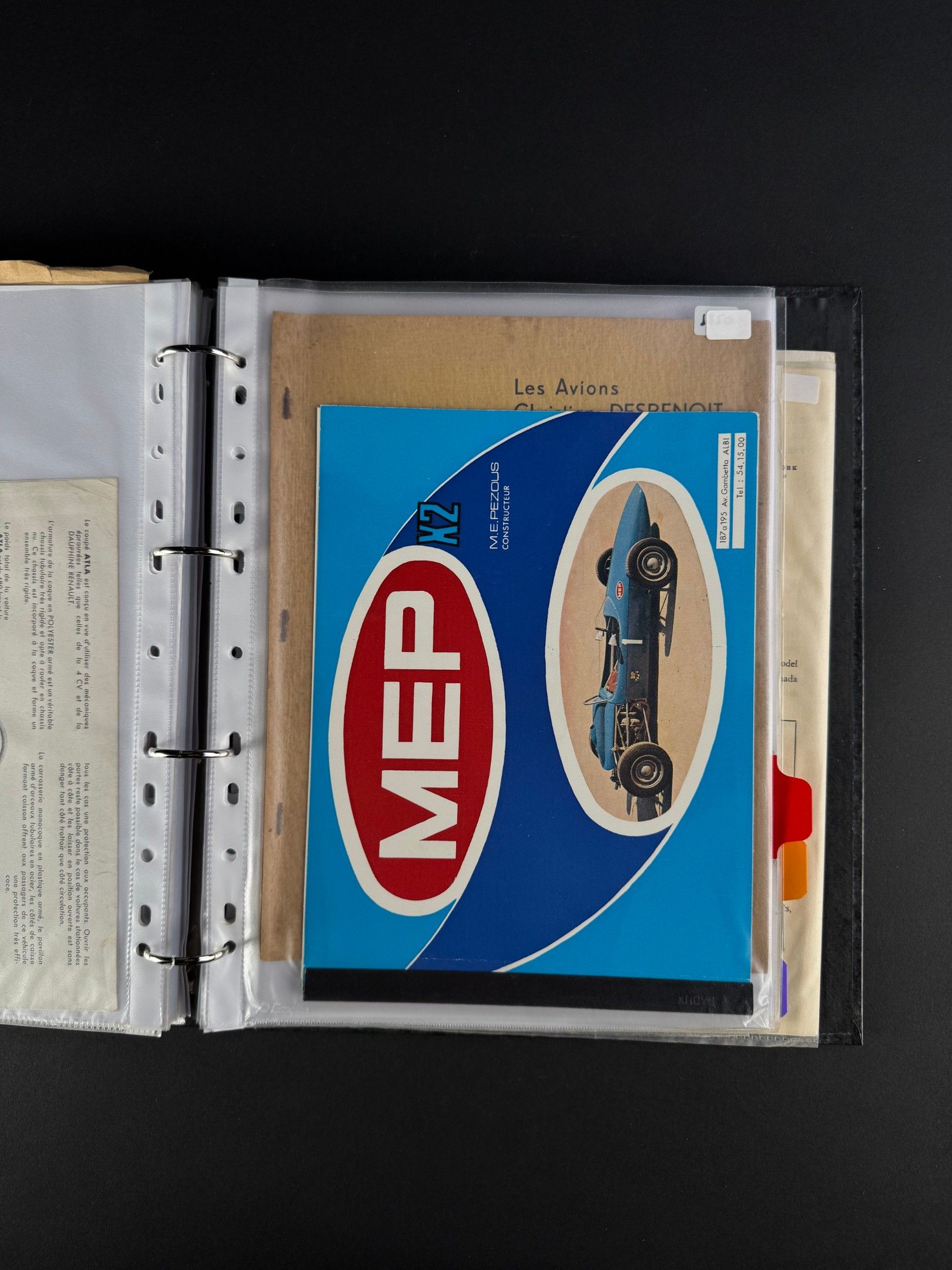 A binder containing approximately 53 advertisements and leaflets from the following brands: ATLA, CHAUSSON, D.B Deutsch Bonnet, DESBENOIT, FAR, FLOIRAT, GEORGES IRAT, GH, ISOBLOC, MARATHON, MEP, MONOPOLE, PICHON PARAT, RAFALE, SHERPA, SOMUA.