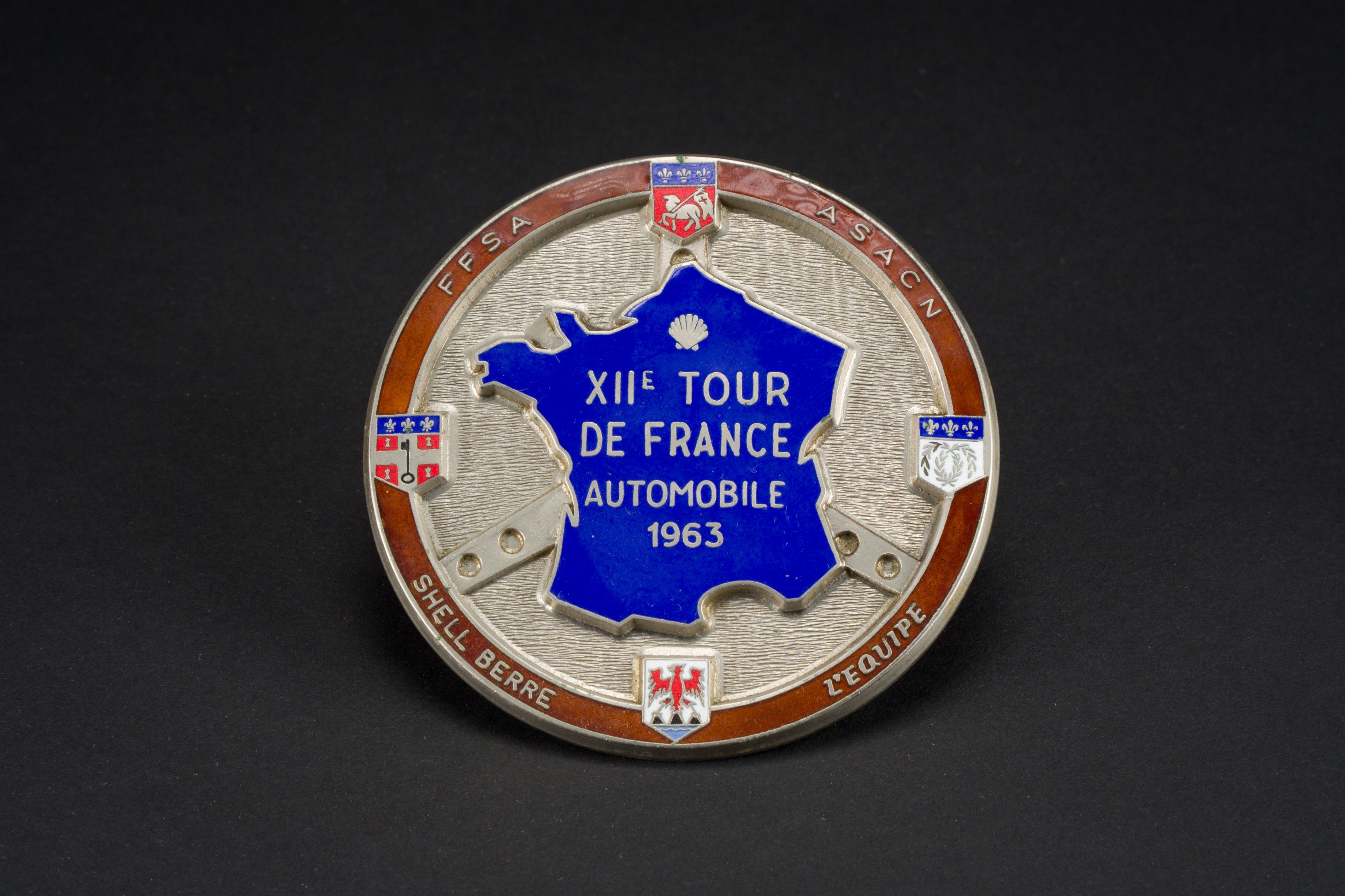 Enamelled metal grille plate "XIIe Tour de France Automobile, 1963", made by Fraisse-Demey Paris.