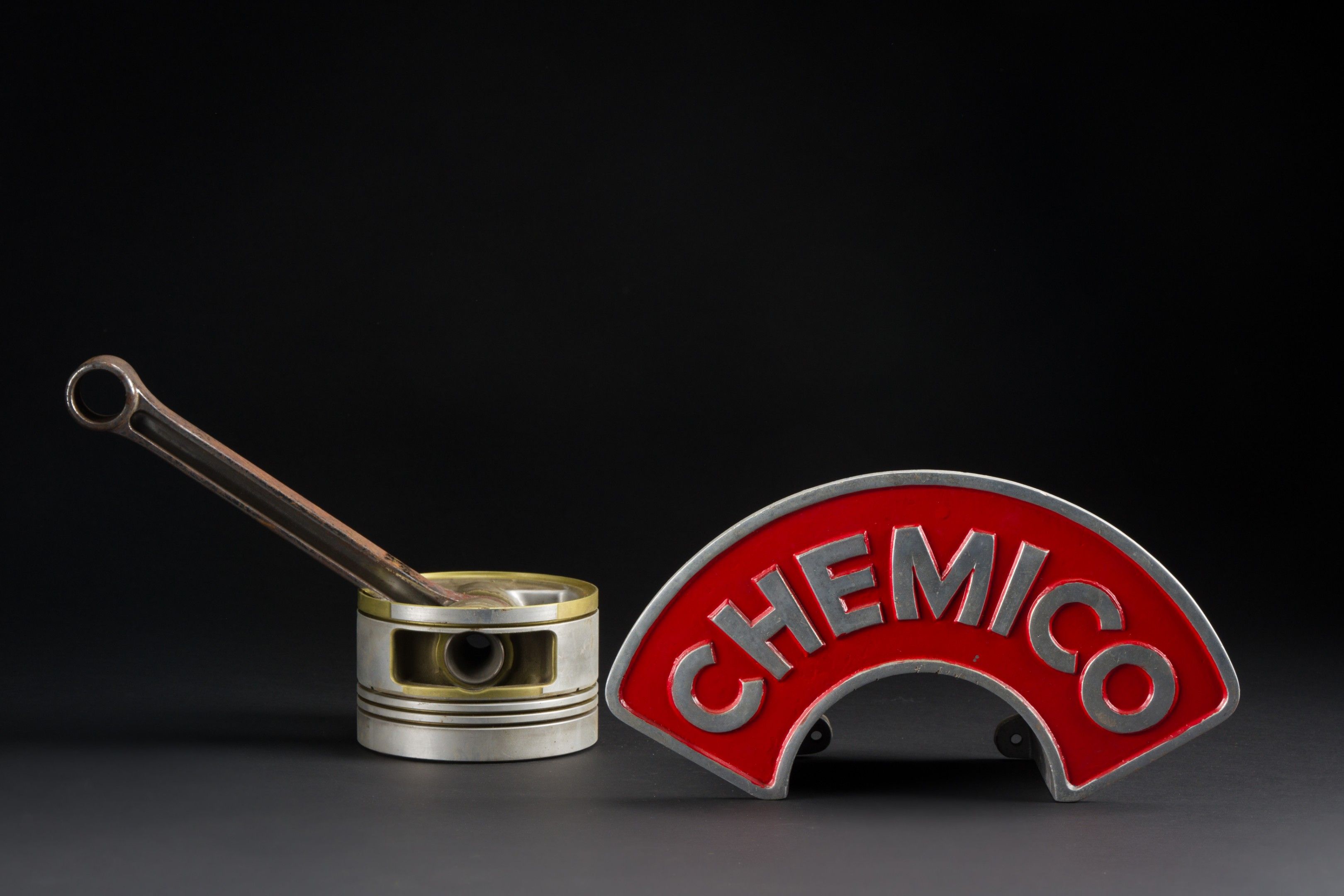 CHEMICO Signed cast aluminium pipe bracket on red lacquered …
