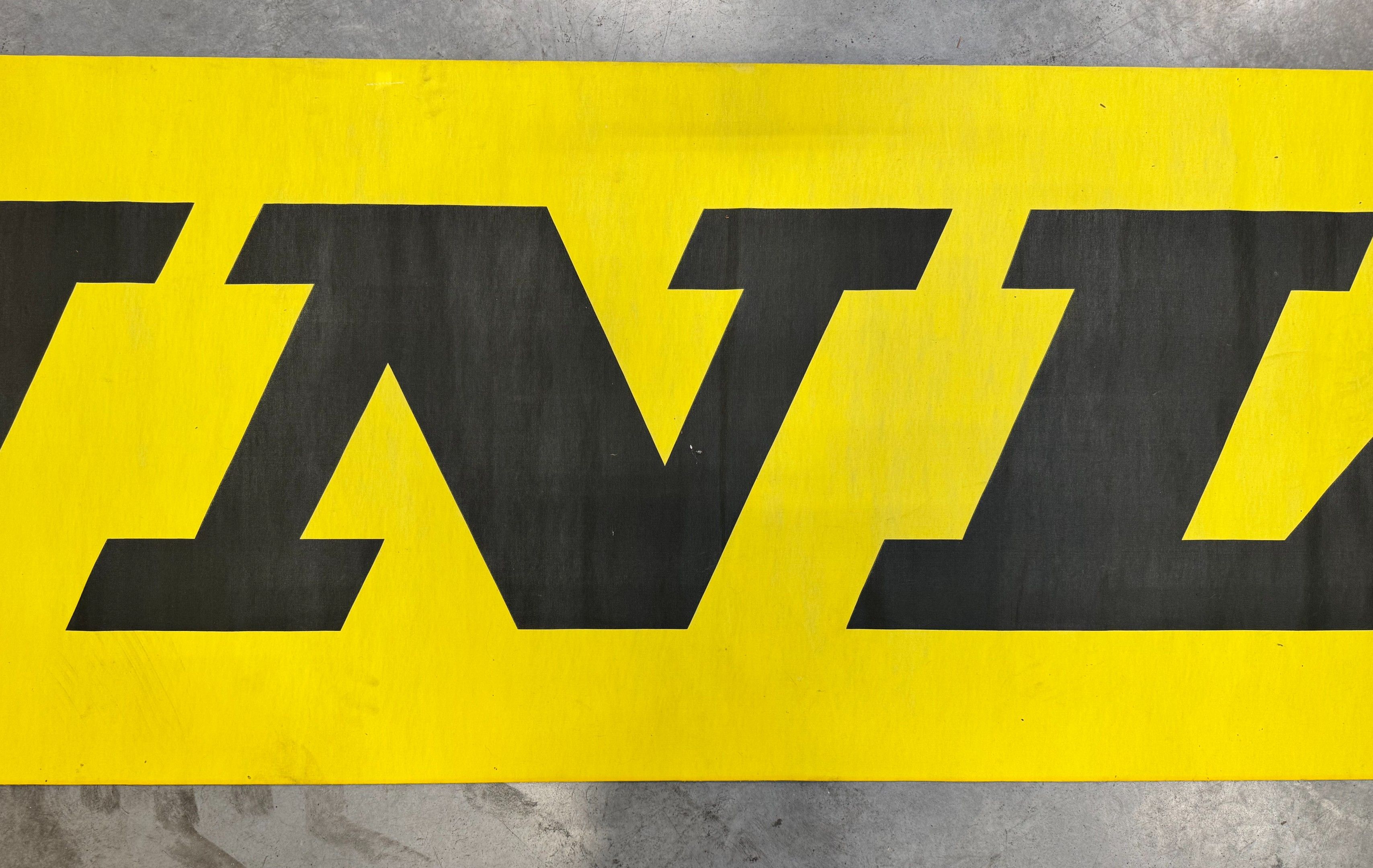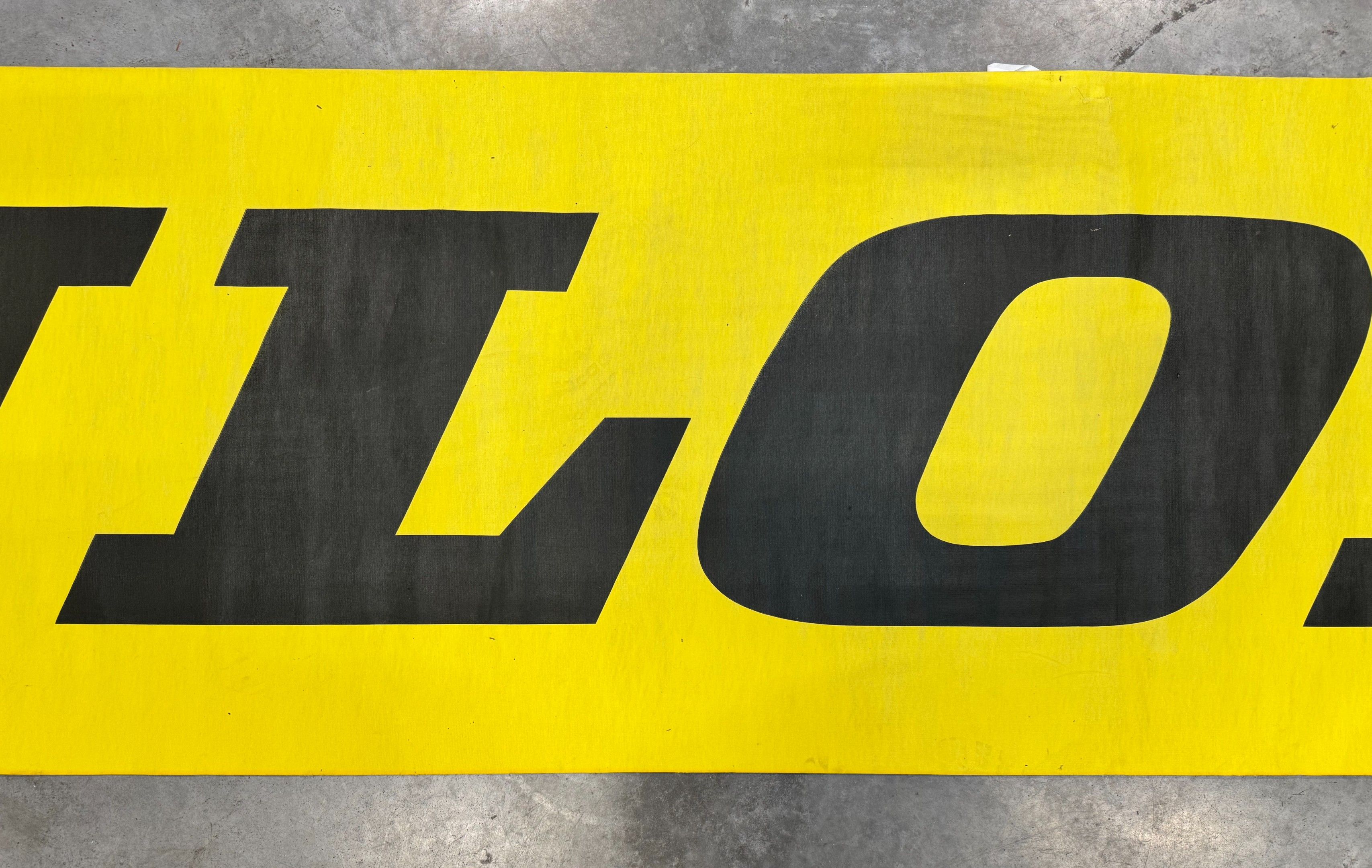 Large "Dunlop" circuit banner in printed fabric on a yellow background.