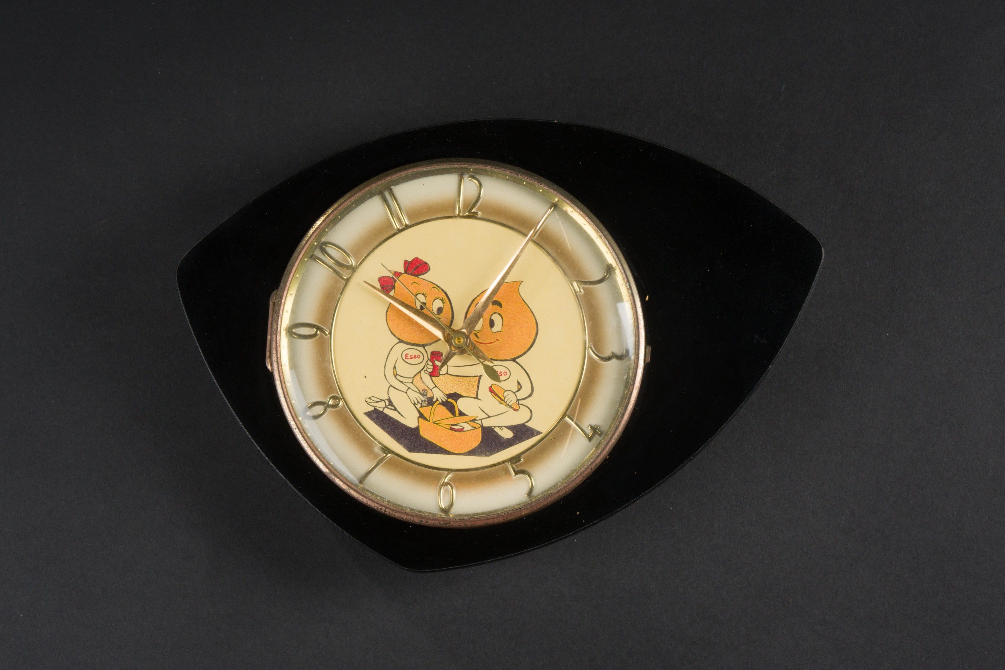 Quartz wall clock in chipboard, metal and glass, with Mr and Mrs oil drop motif.