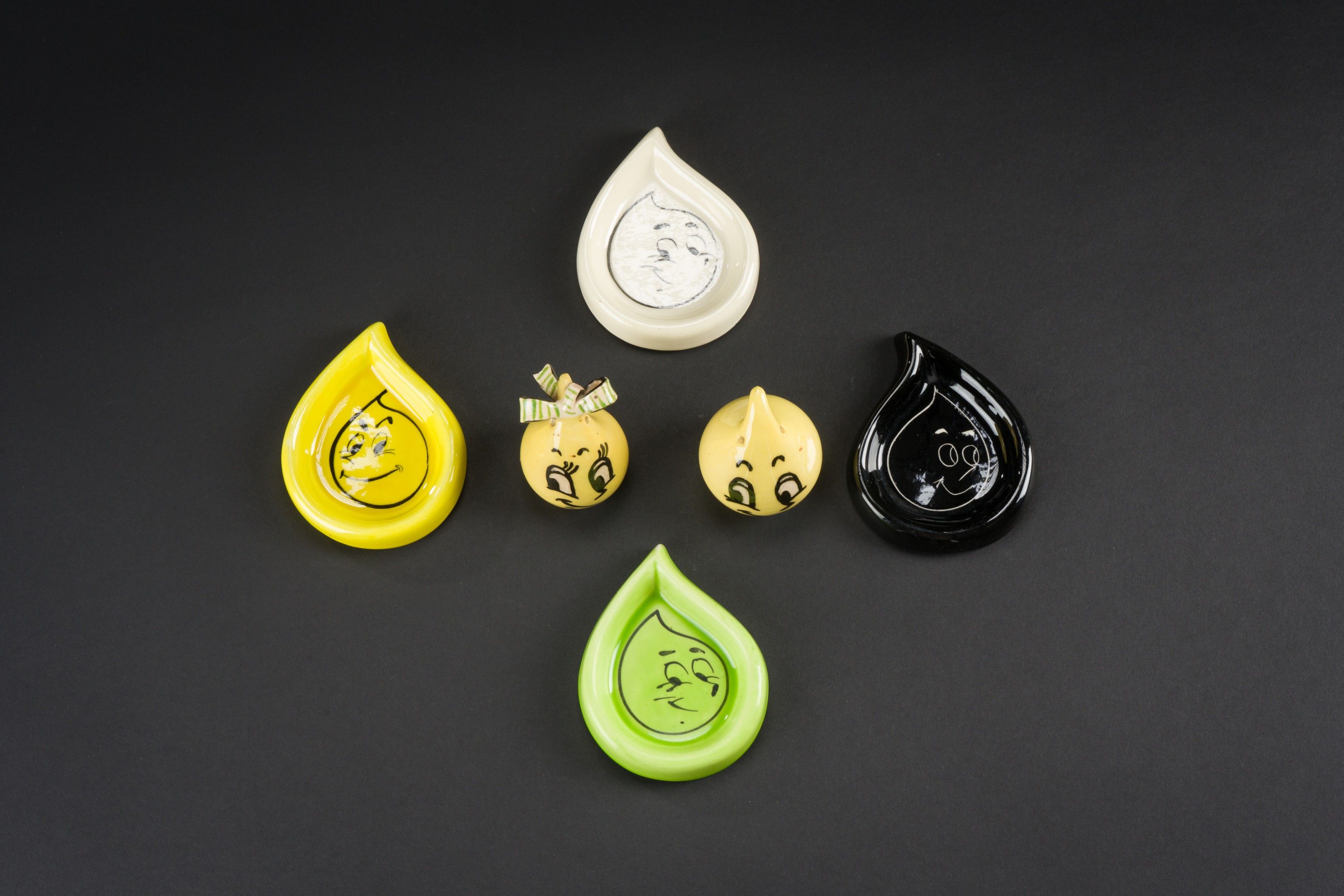 - Two yellow background ceramic hanging subjects, Monsieur and Madame goutte d'huile. H_9 cm