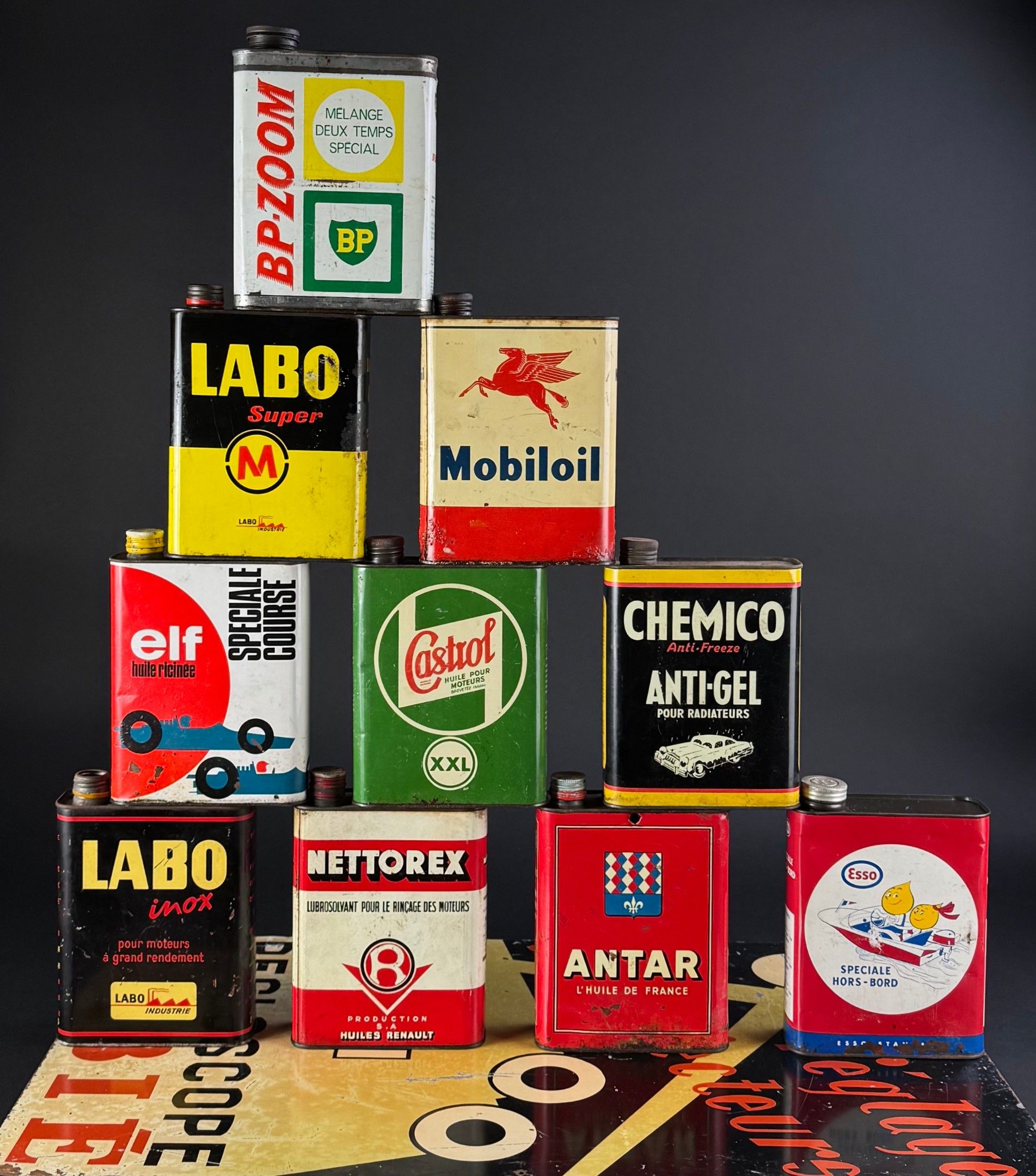 Set of 10 two-litre cans in screen-printed sheet metal, including motor oils, solvents and antifreeze: ANTAR, ESSO, CASTROL, ELF, LABO, BP, MOBILOIL and others.