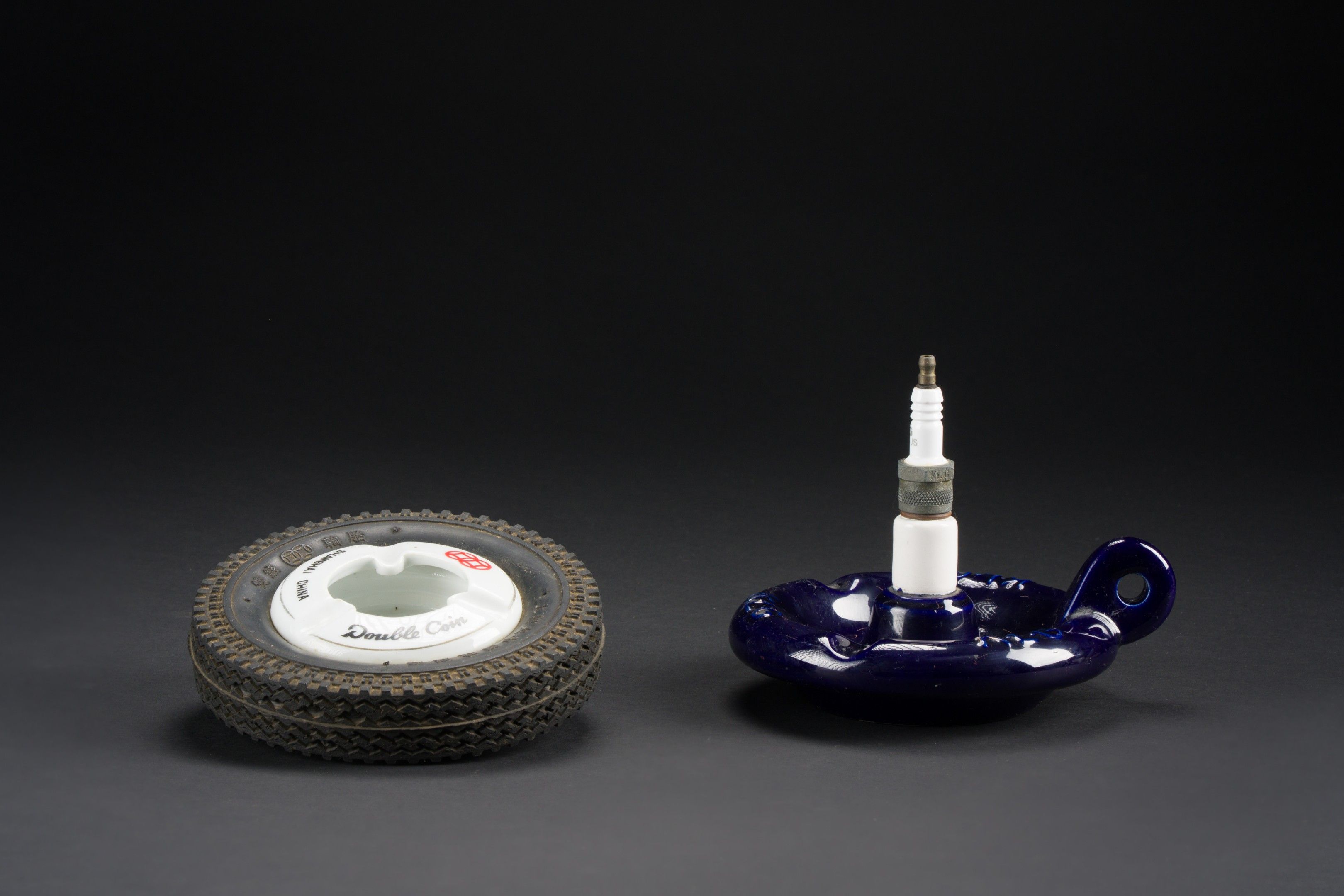 Set of 2 ashtrays: - K.L.G in blue ceramic, with a candle in…