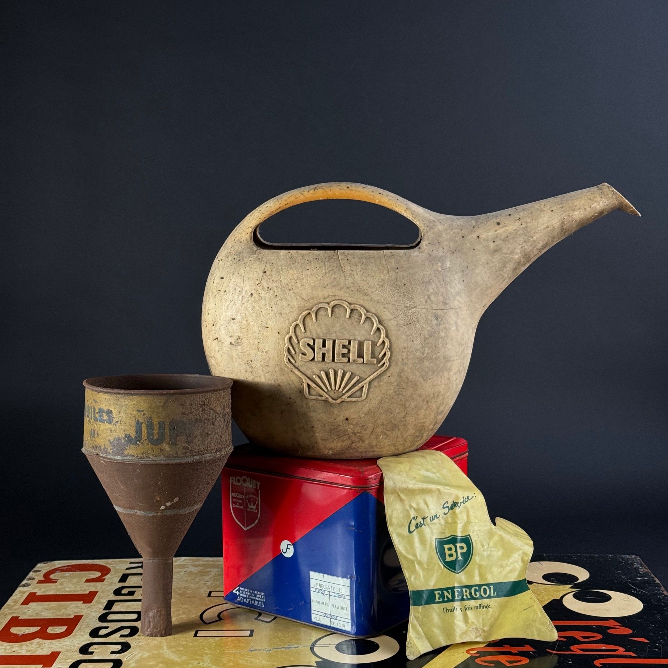 Lot of promotional items including a SHELL watering can, a BP glove, a FLOQUET metal box and a MOTO NAPHTA funnel.