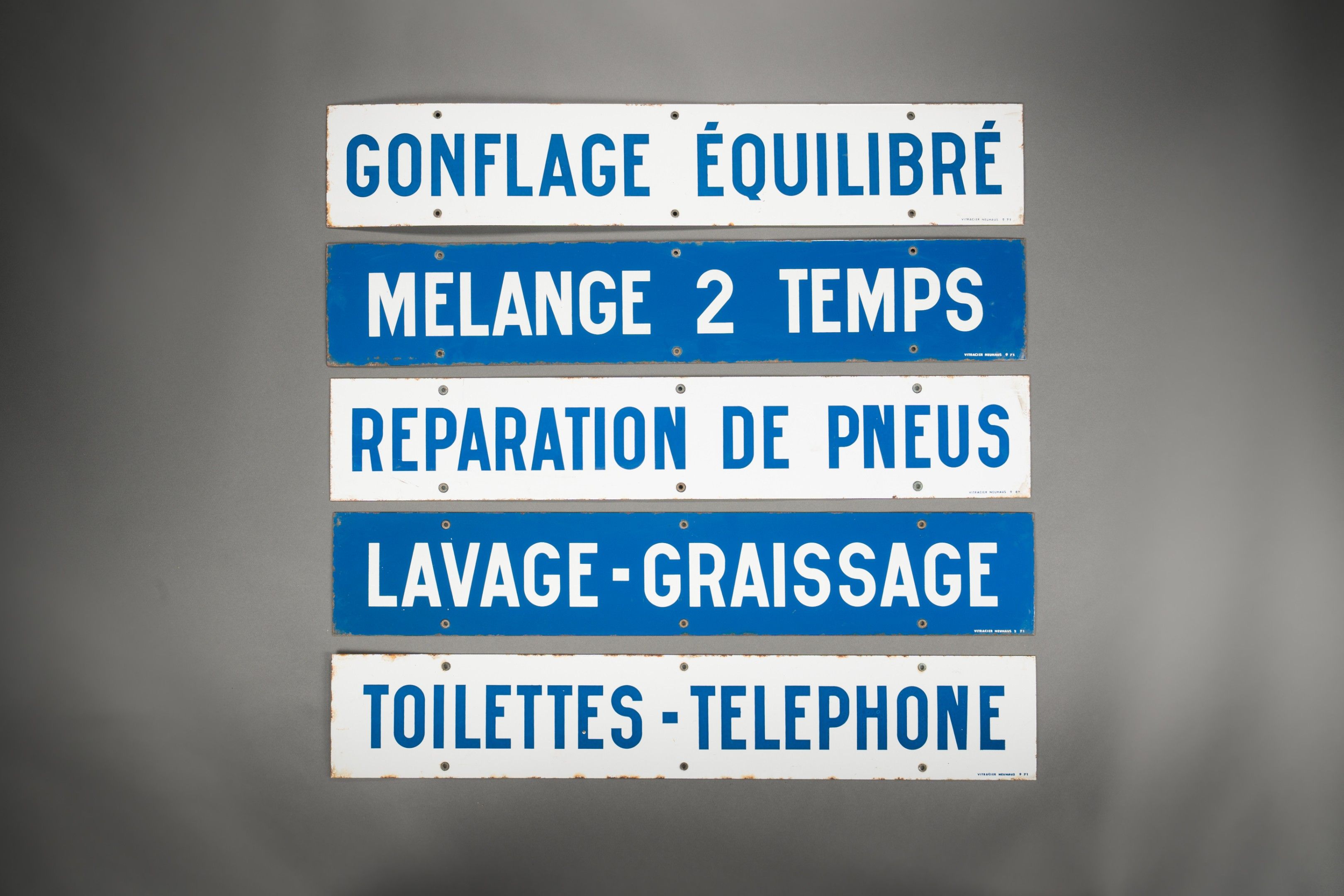 Set of five enamelled sheet metal plates, with blue or white background, with lettering in inverted colours "TOILETS - TELEPHONE" - "TIRE REPAIR" - "GONFLAGE EQUILIBRE" - "MELANGE 2 TEMPS" - "LAVAGE - GRAISSAGE". Published by Vitracier Neuhaus 9-71 or 2-71