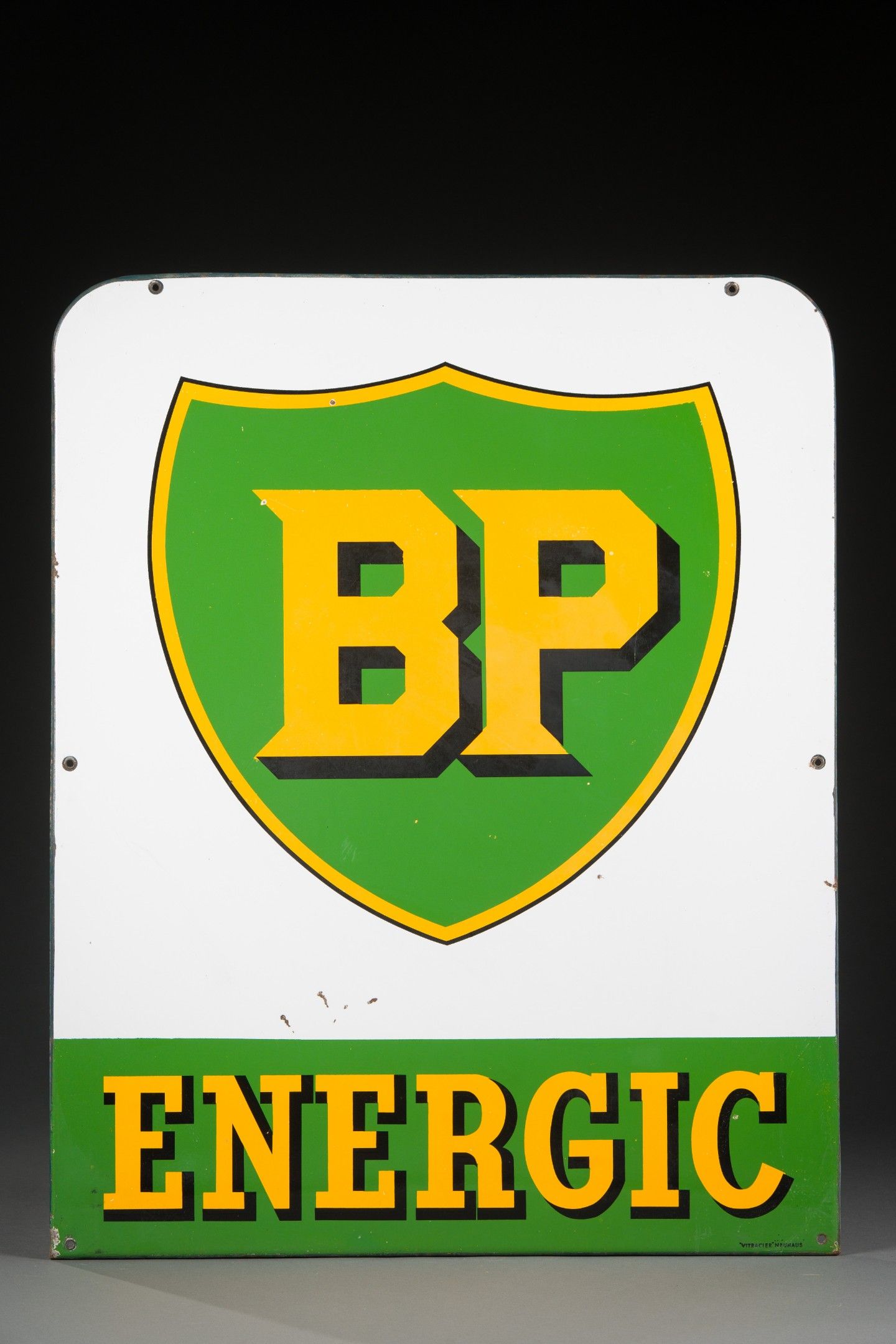 Rectangular chamfered plate in enamelled sheet metal "BP ENERGIC", published by Vitracier Neuhaus.