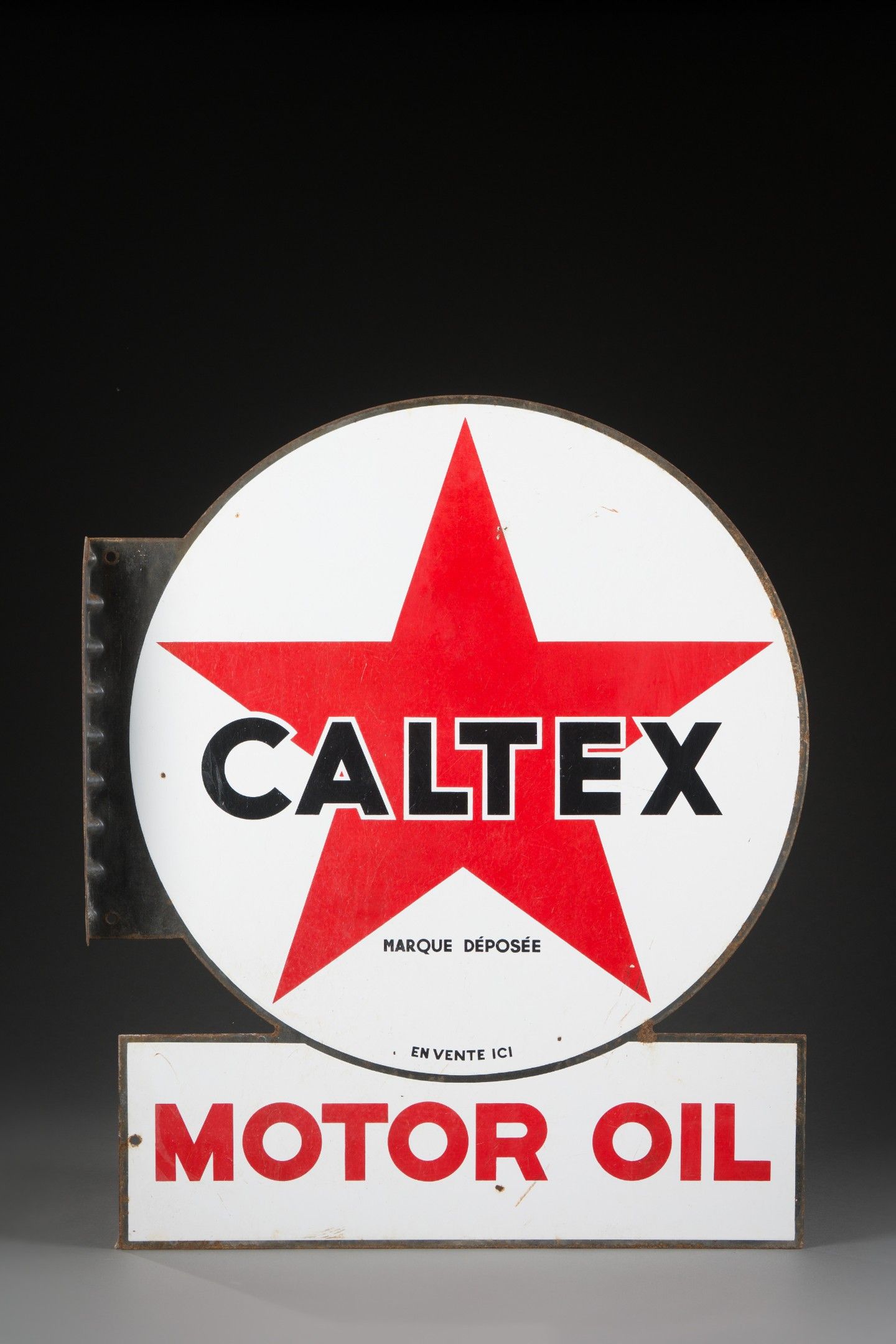 Double-sided angle plate in enamelled sheet metal " CALTEX MARQUE DEPOSEE EN VENTE ICI MOTOR OIL ", with angle iron.