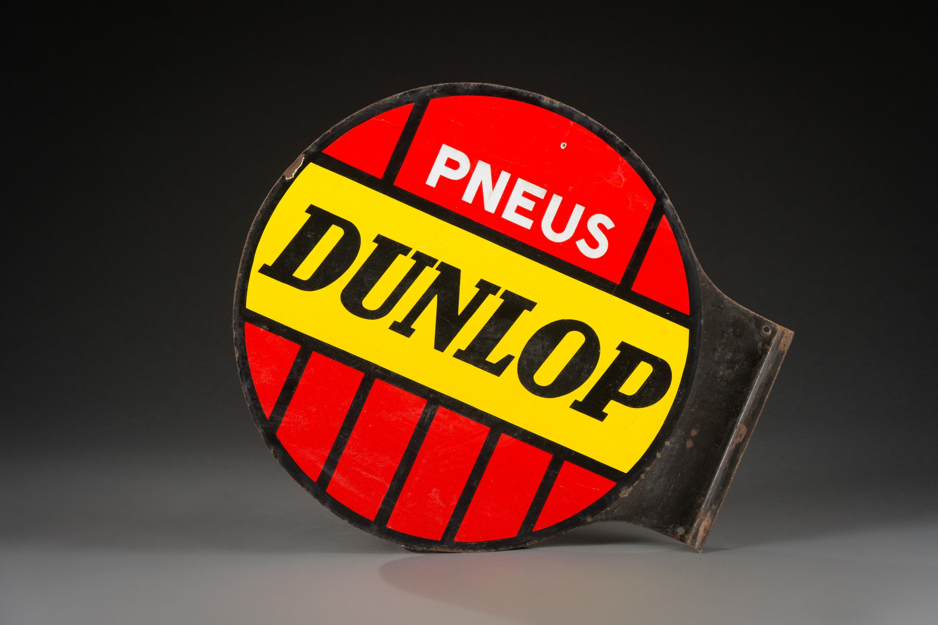 Double-sided circular enamelled sheet metal square plate "PNEUS DUNLOP", published by Emaillerie Alsacienne Strasbourg - Hoenheim, with angle iron.