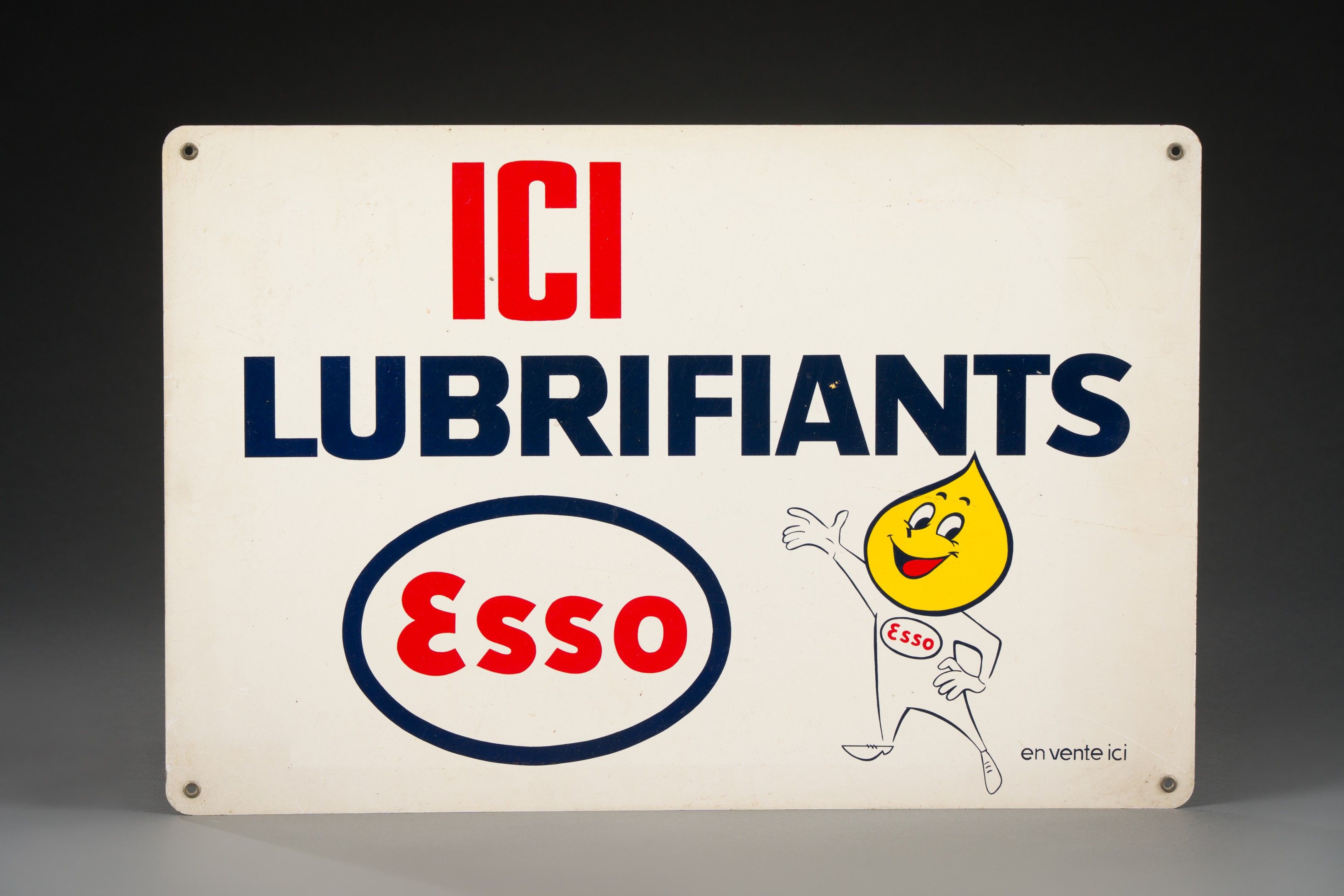 Rectangular plaque in enamelled sheet metal "ICI LUBRIFIANTS ESSO EN VENTE ICI". ed. Imprelac.