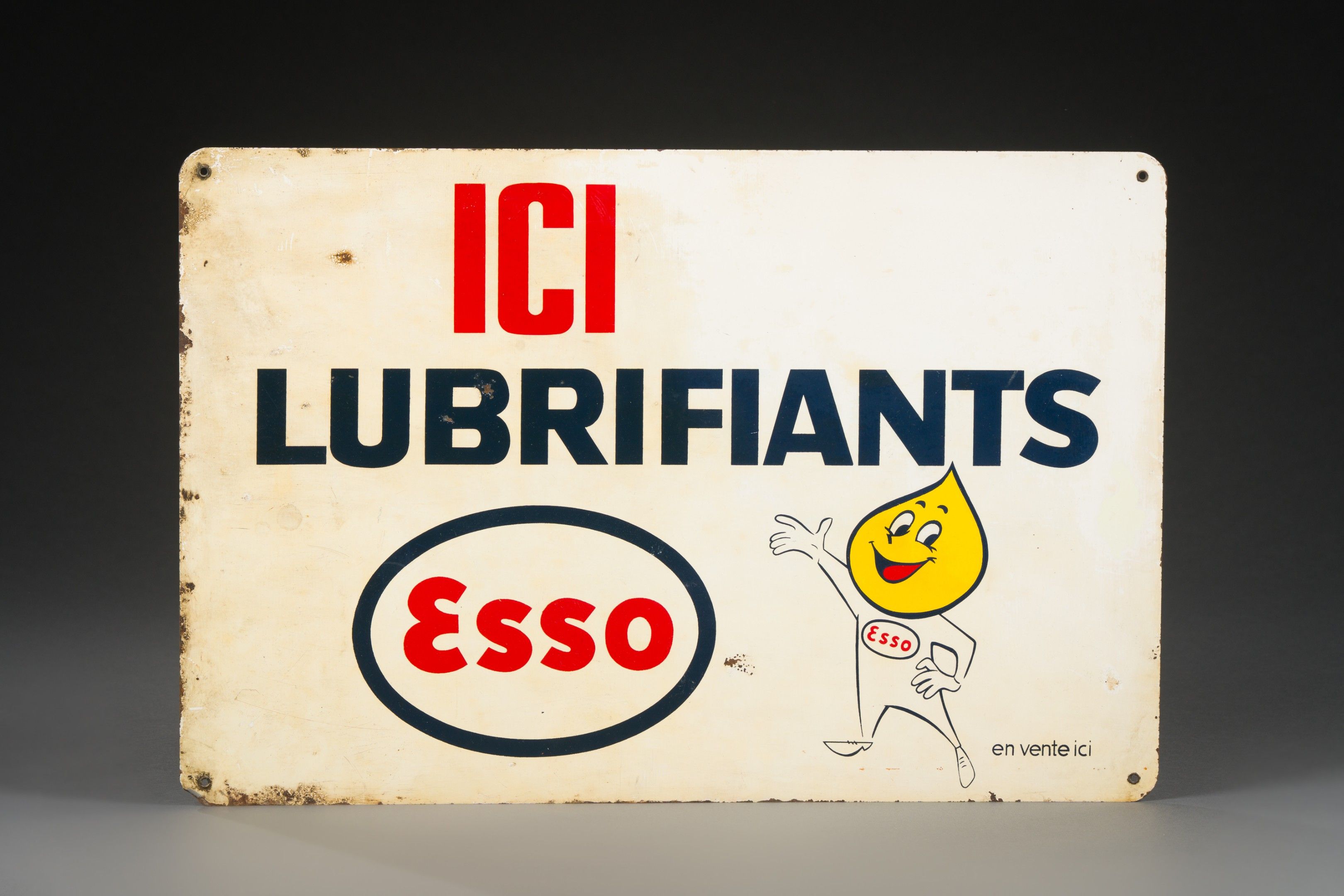 Rectangular enamelled sheet metal plate "ICI LUBRIFIANTS ESSO EN VENTE ICI". ed. SAS Ago.