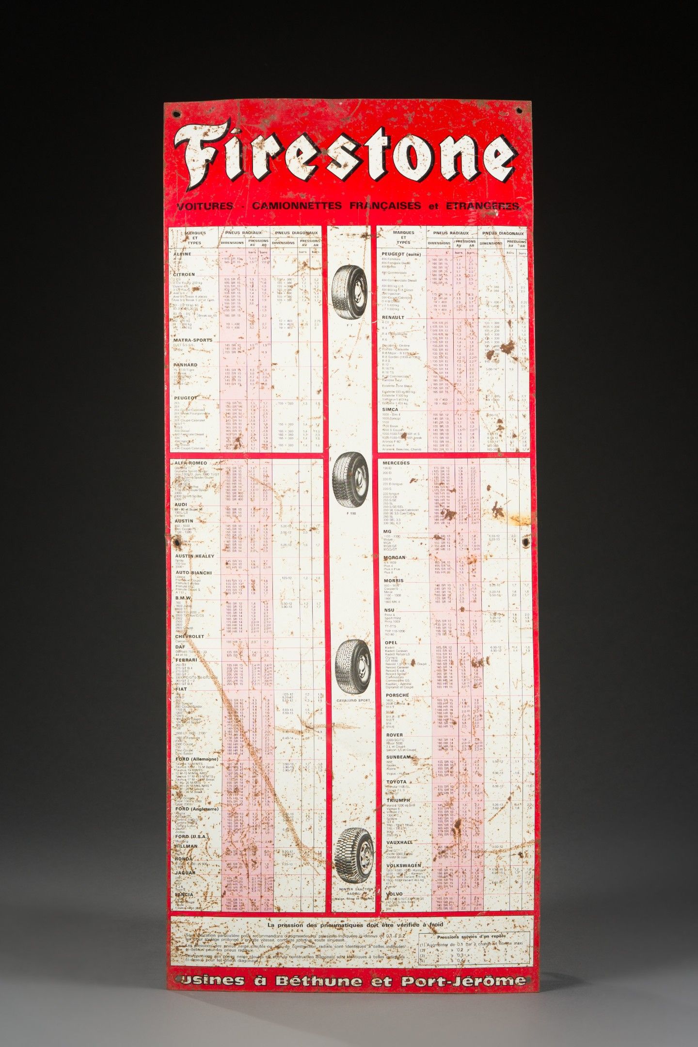 Set of two rectangular painted sheet metal plaques "FIRESTONE" (tyre inflation advice) - "GOOD YEAR" (Zeppelin)