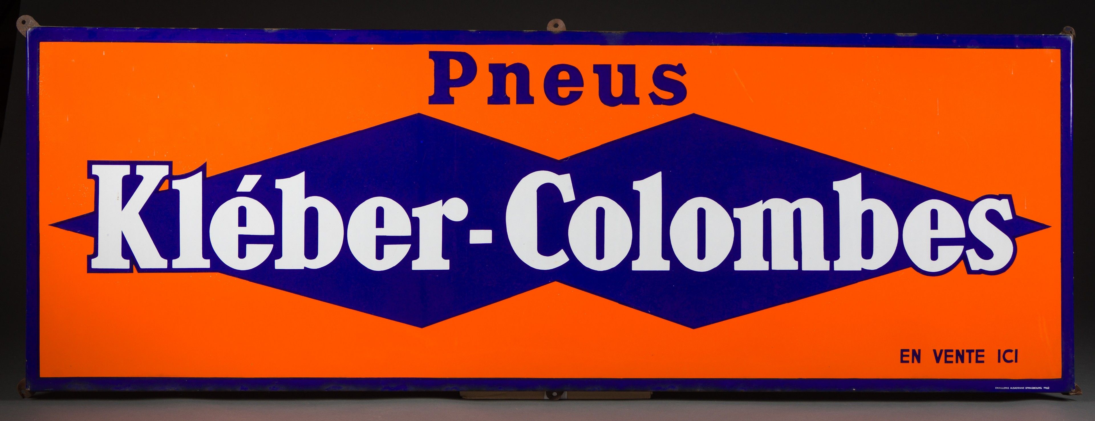 Chamfered rectangular plaque in enamelled sheet metal "PNEUS KLEBER-COLOMBES EN VENTE ICI", published by Emaillerie Alsacienne Strasbourg 1962.