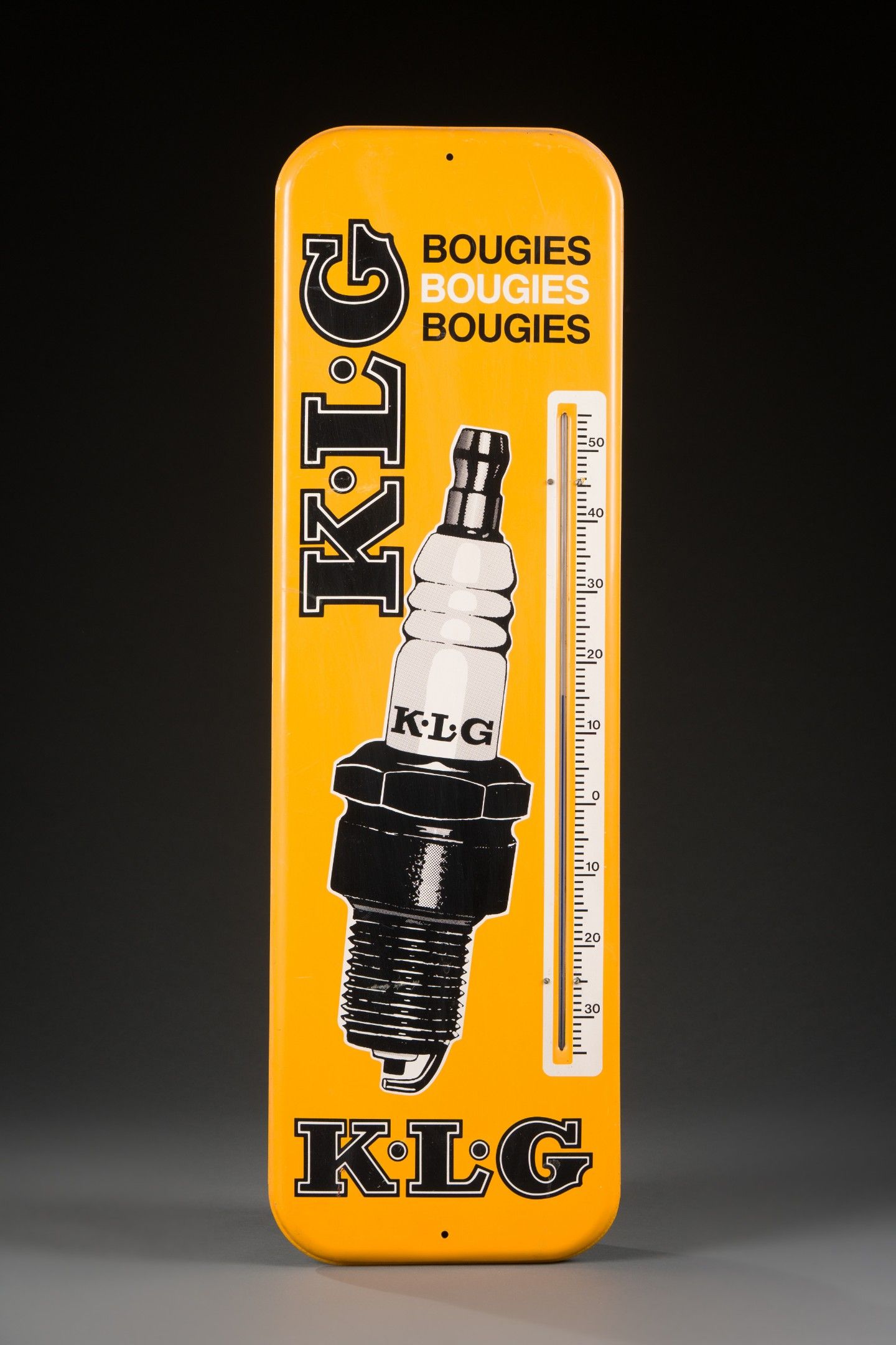 Plate thermometer, rectangular chamfered shape, in enamelled sheet metal "K.L.G BOUGIES".