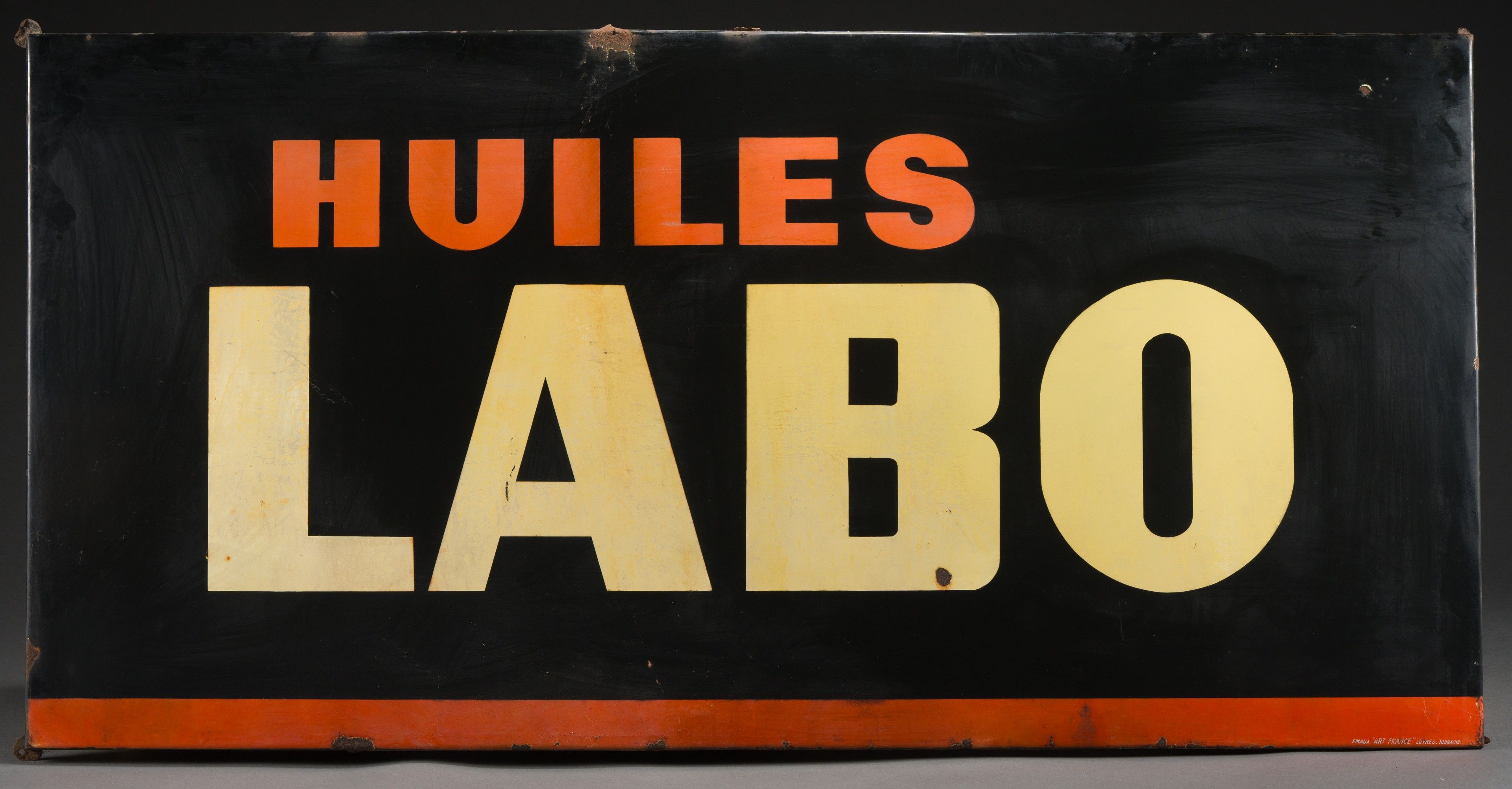 Rectangular chamfered plate in enamelled sheet metal "HUILES LABO", Emaux Art France, Luynes Tourraine.