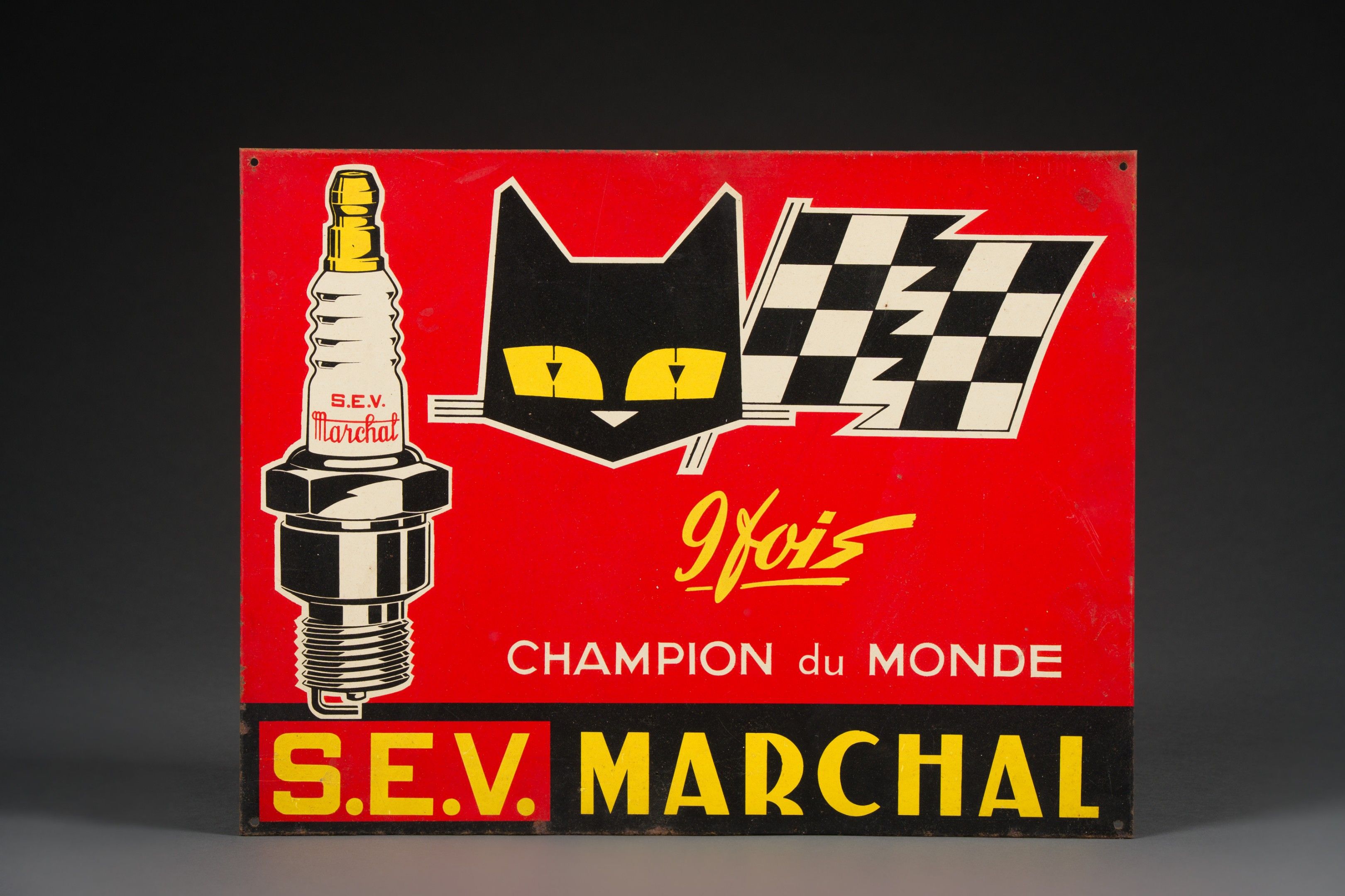 Rectangular chamfered plaque " S.E.V. MARCHAL 9 FOIS CHAMPION DU MONDE " (S.E.V. MARCHAL 9 TIMES WORLD CHAMPION)