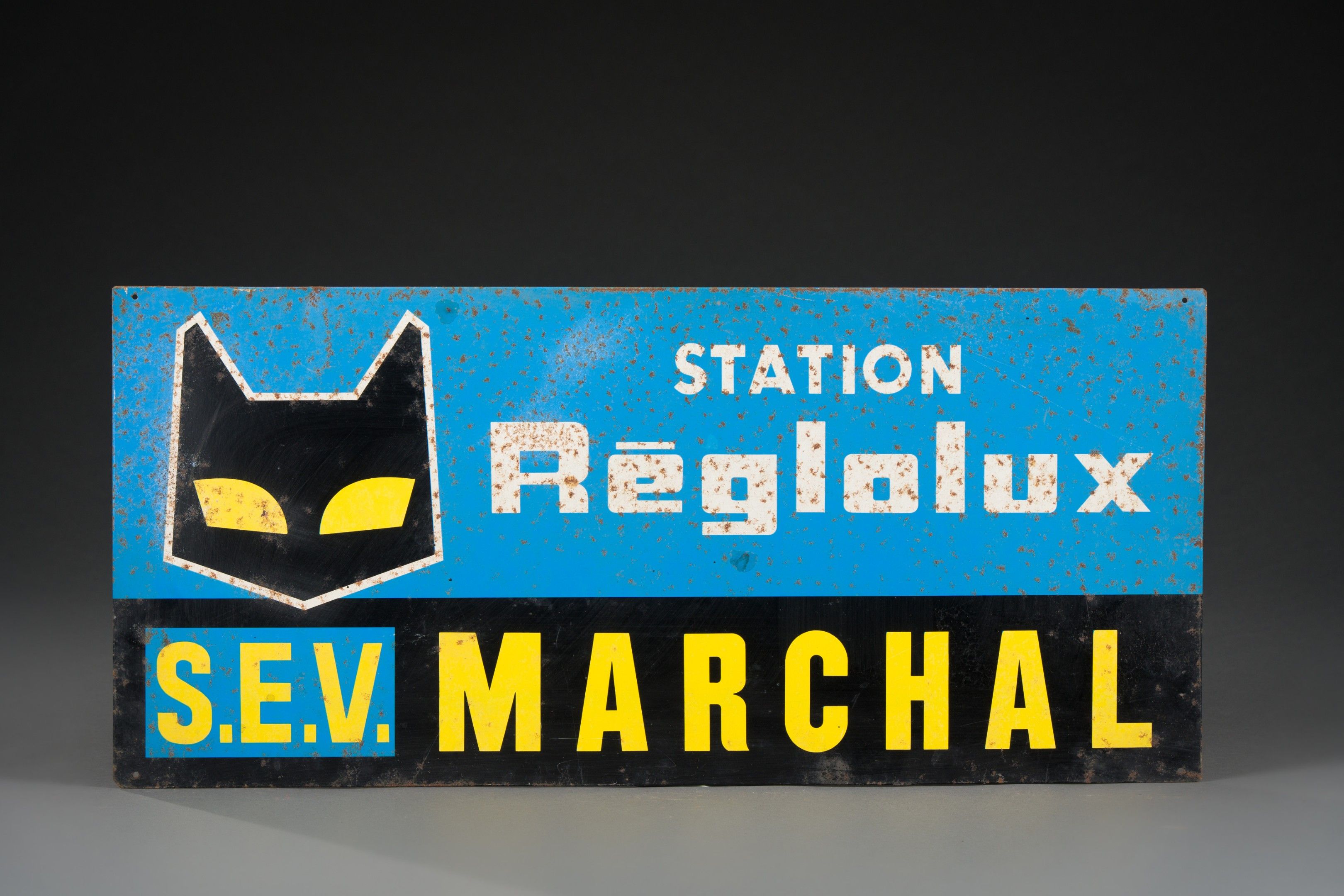 Rectangular plaque in painted sheet metal " STATION Réglolux S.E.V. MARCHAL ".