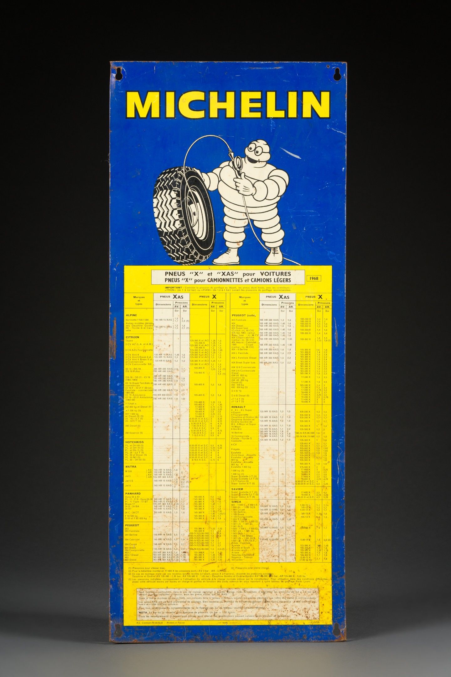 Rectangular enamelled plate "MICHELIN PNEUS "X" et "XAS" pour VOITURES PNEUS "X" pour CAMIONNETTES et CAMIONS LEGERS 1968" (tyre pressure advice), ed. R.C. Clermont-Fd 55-B-50 Imp. Noël Auxerre