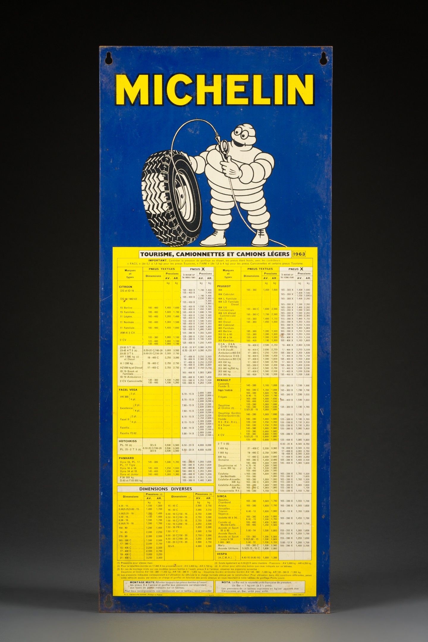Rectangular enamelled sheet metal plaque "MICHELIN TOURISME, CAMIONNETTES, et CAMIONS LEGERS 1963" (tyre pressure advice), ed. R.C. Clermont-Fd 55-B-50 Imp. Noël Auxerre