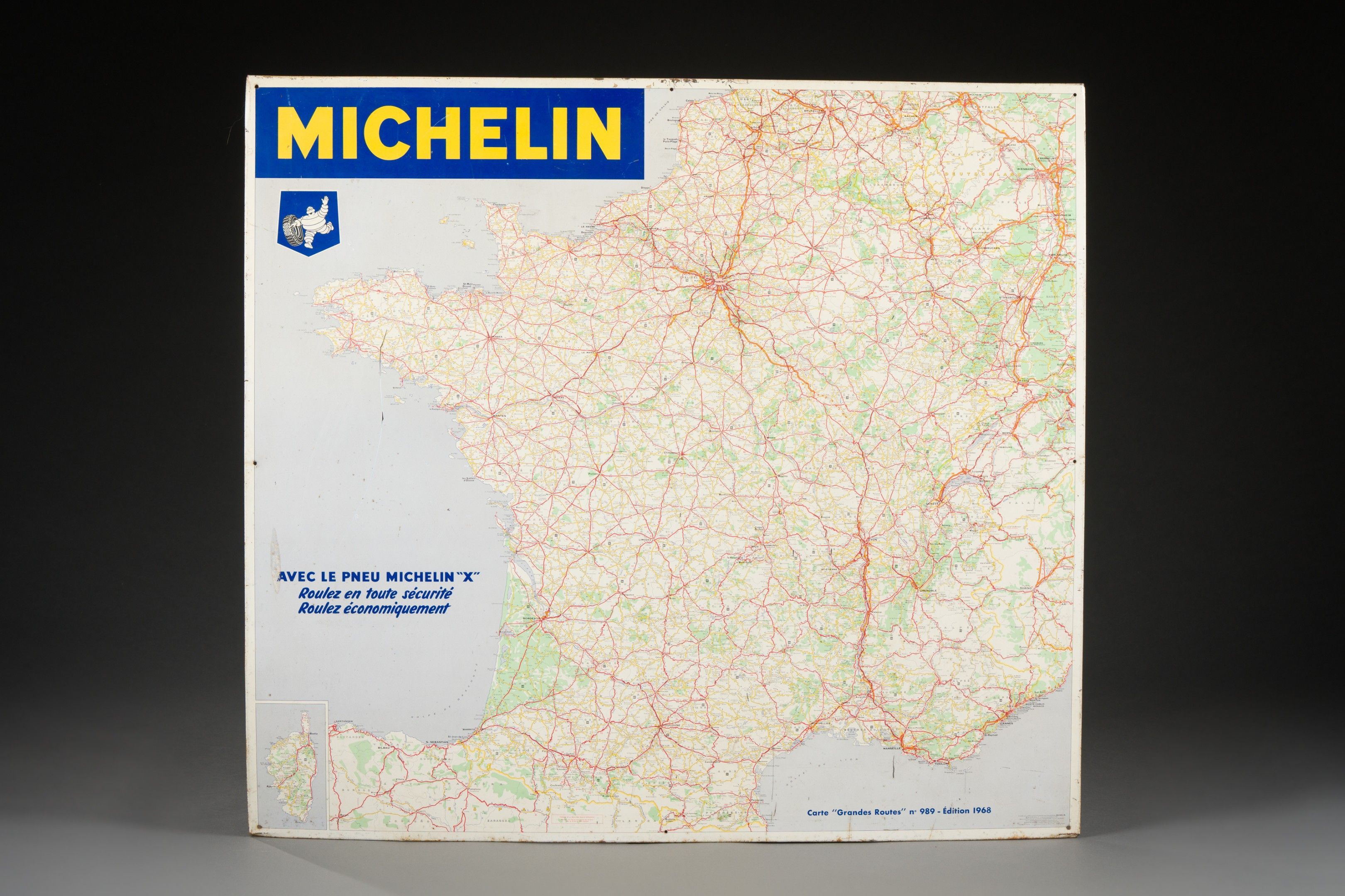 Rectangular plaque in silk-screen printed sheet metal "Carte Grandes Routes n° 989 - Edition 1968, published by JJ Carnaud et Forge.