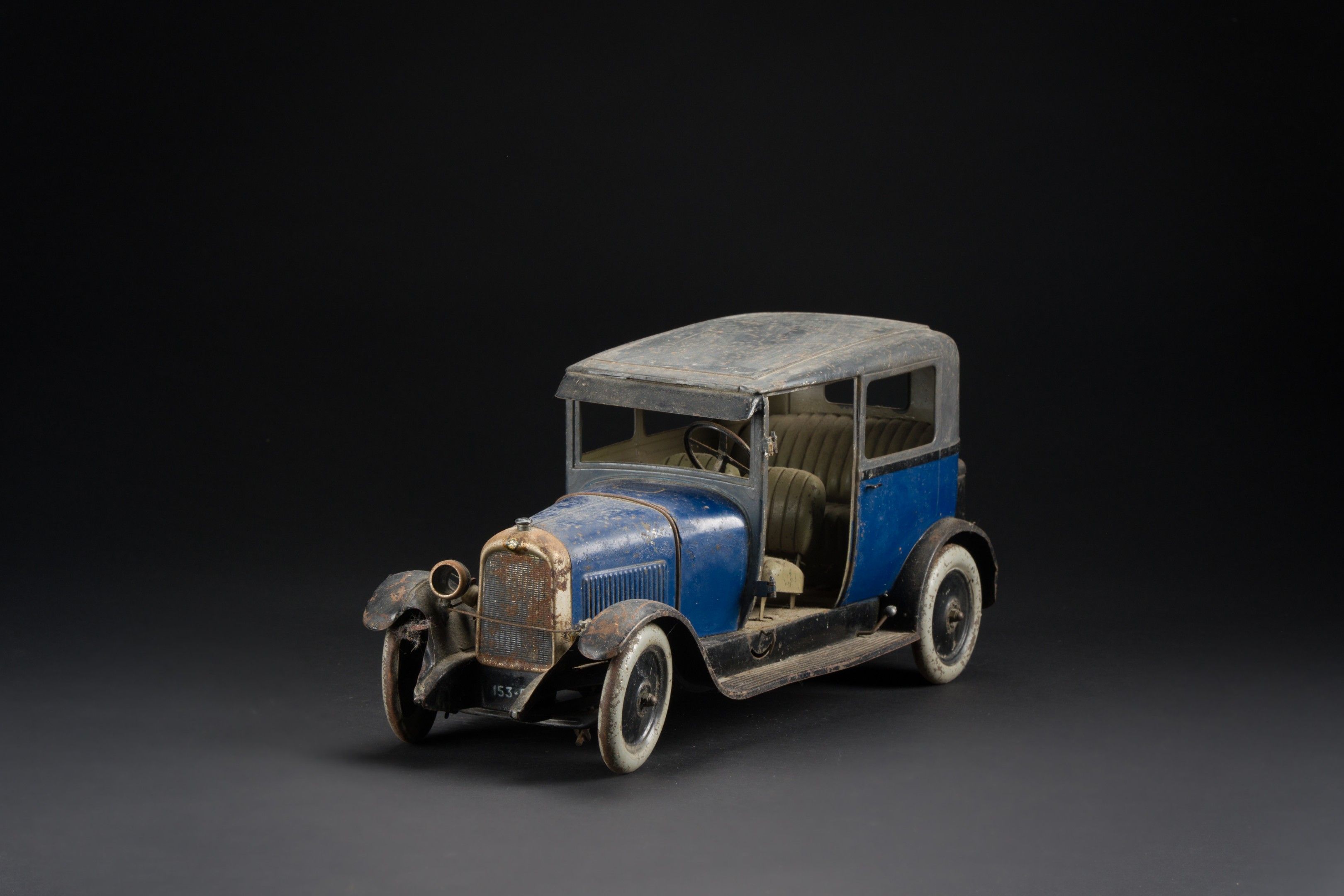 Citroën B14 saloon in dark blue painted sheet metal, grey roof, black wings, chassis stencilled in white "automobiles mécaniques André CITROEN, made in France", registration 153 E 51.
