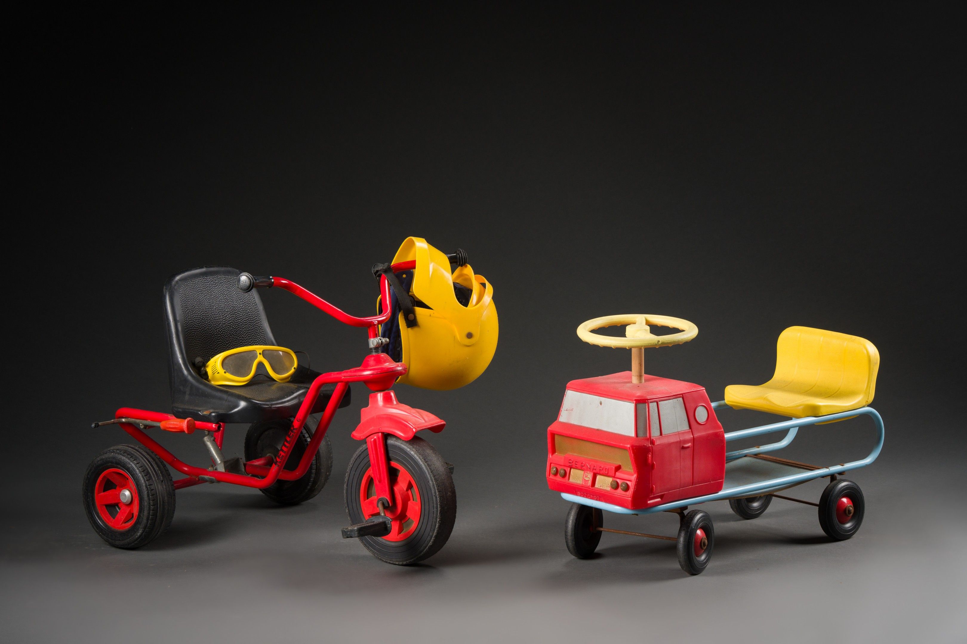 Set comprising a KETTLER tricycle with red tubular metal frame, a BERNARD truck in metal and pvc and a yellow full-face helmet with pvc mask.