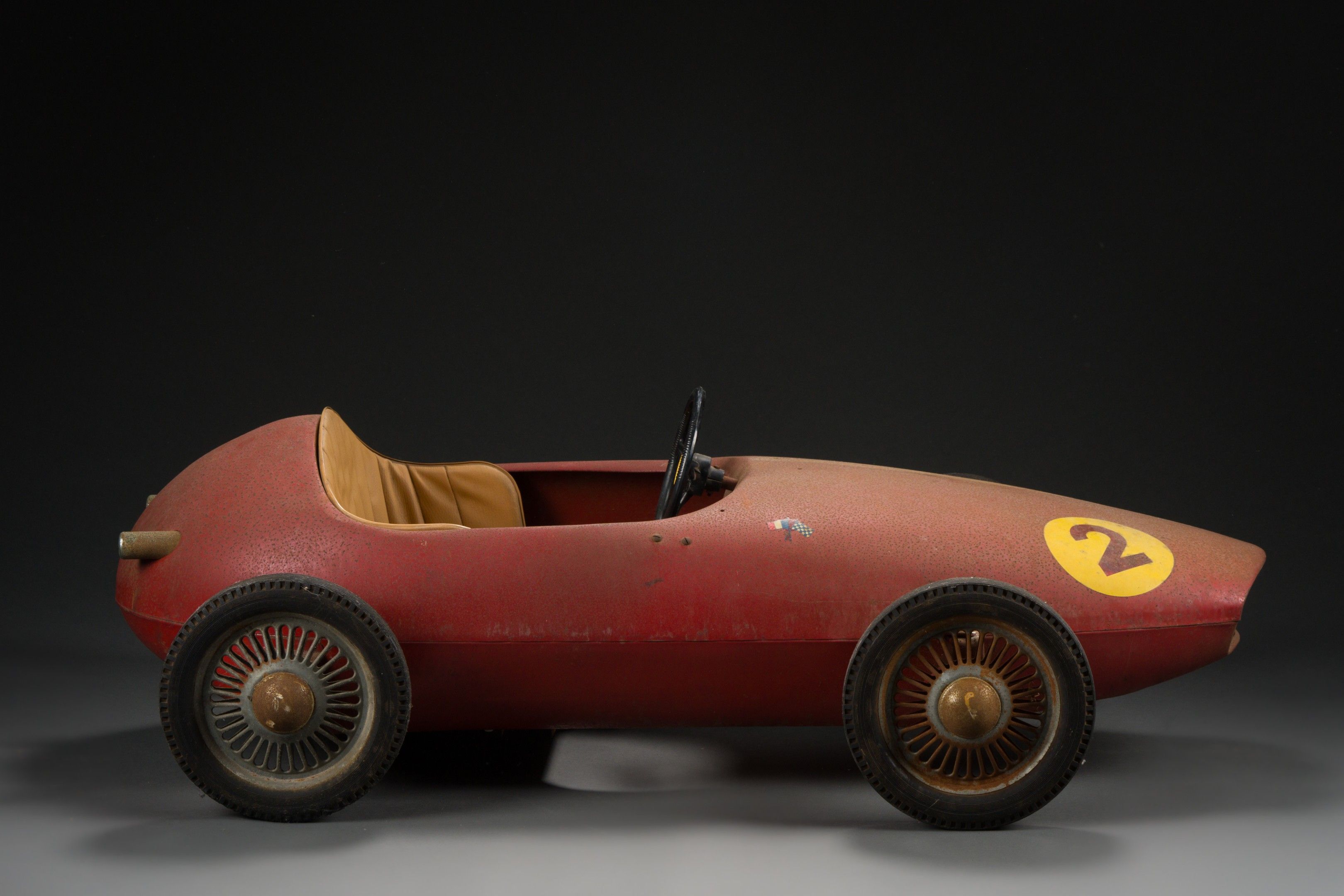 Children's pedal car, in red painted sheet metal, bearing the number 2, decorated with the tricolour and chequered flags.