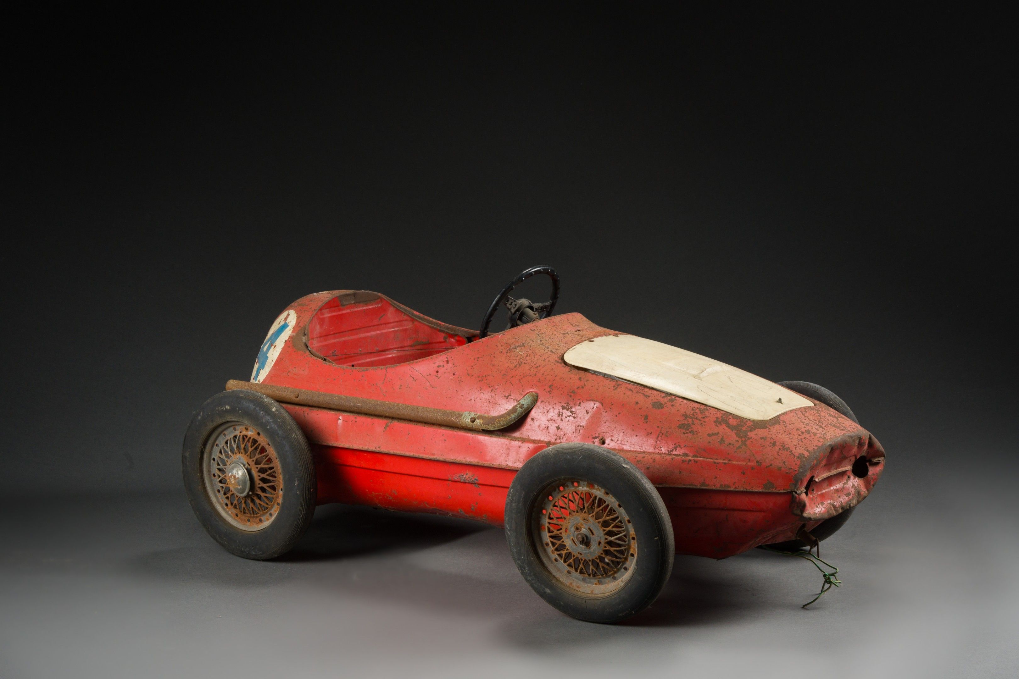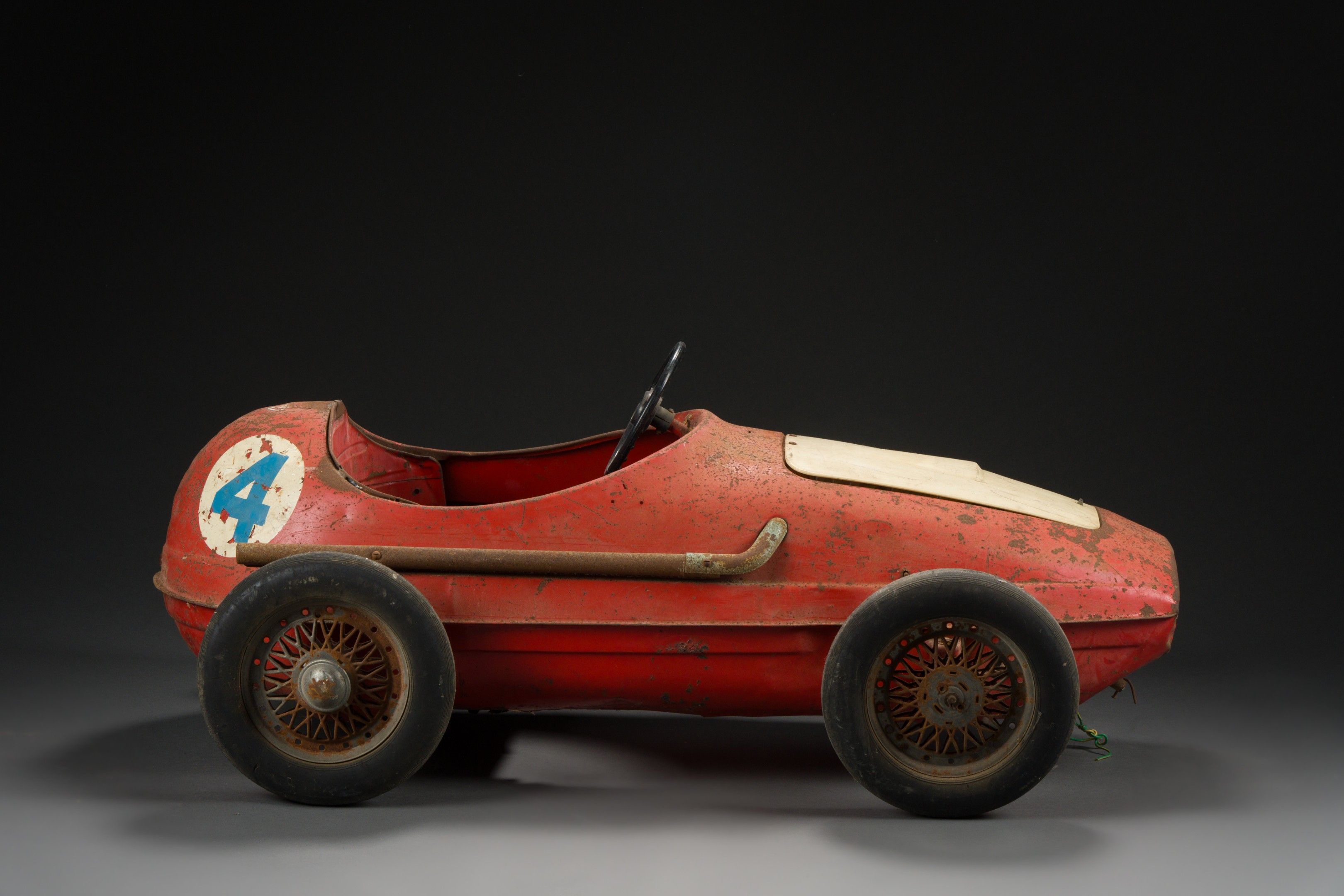 Children's pedal car, in red painted sheet metal, bearing the number 4.