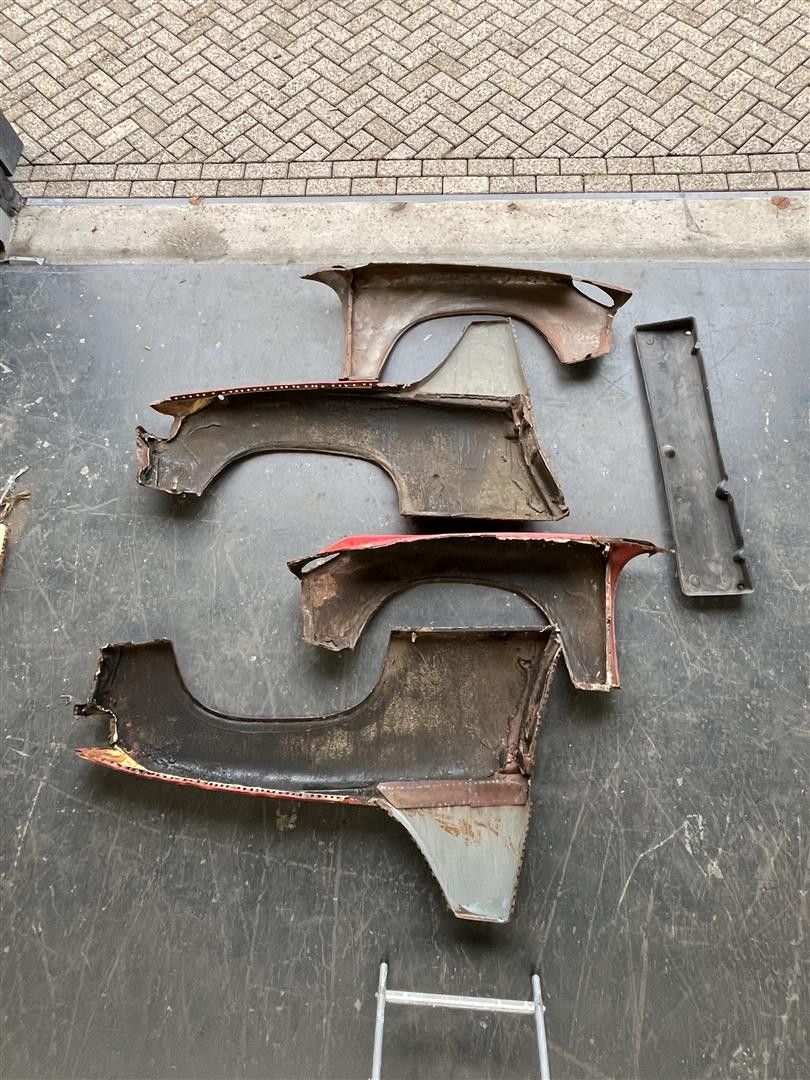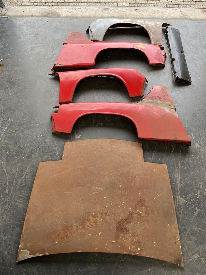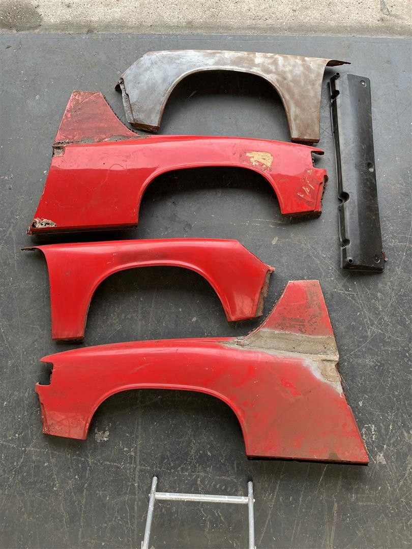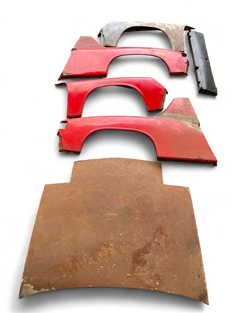 Lot of various sheet metal, fender flares, and a hood. Porsche 914, 1974.