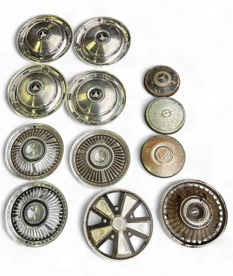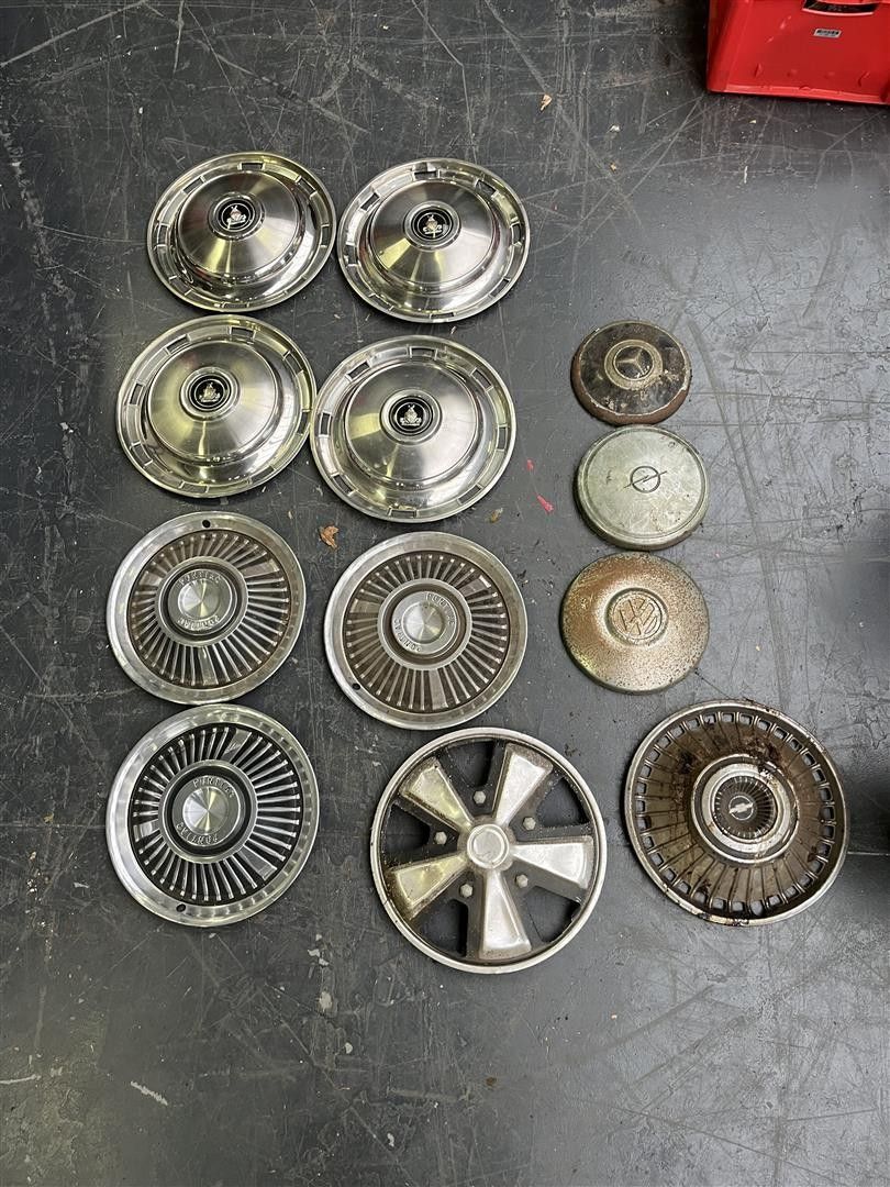 Lot of various vintage wheel covers from various brands including Jaguar, Medercedes and Pontiac.