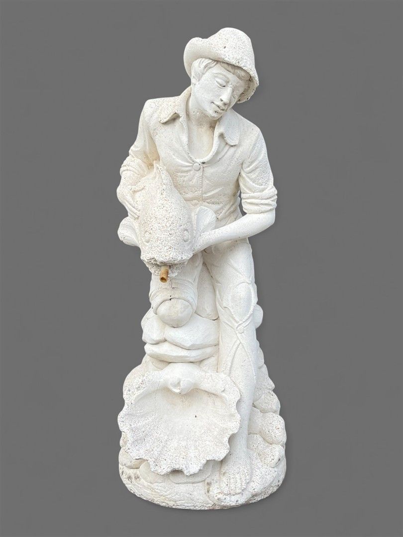 A pond sprinkler or garden statue of a boy with a fish. 93 x 38 x 42 cm.