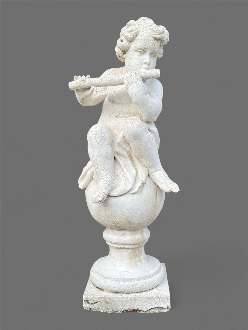 A garden statue of a flute-playing putto. 100 x 37 x 30 cm.
