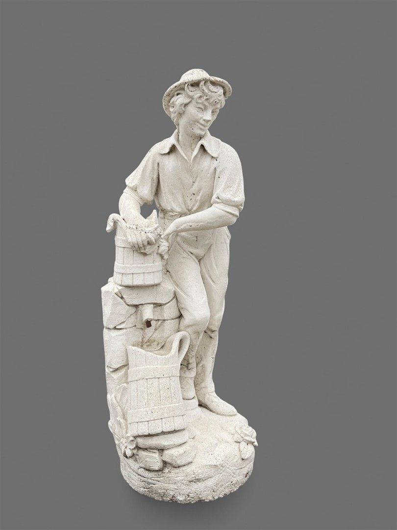 A pond sprinkler / garden statue of a boy with water barrels…