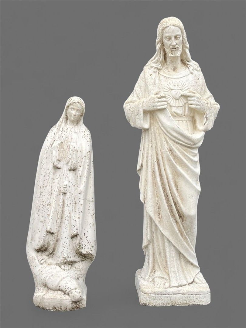 A set of two garden statues in the form of Christ with the Sacred Heart and Mary, Mother of God. 83 x 30 x 20 cm. en 62 x 20 x 14 cm.
