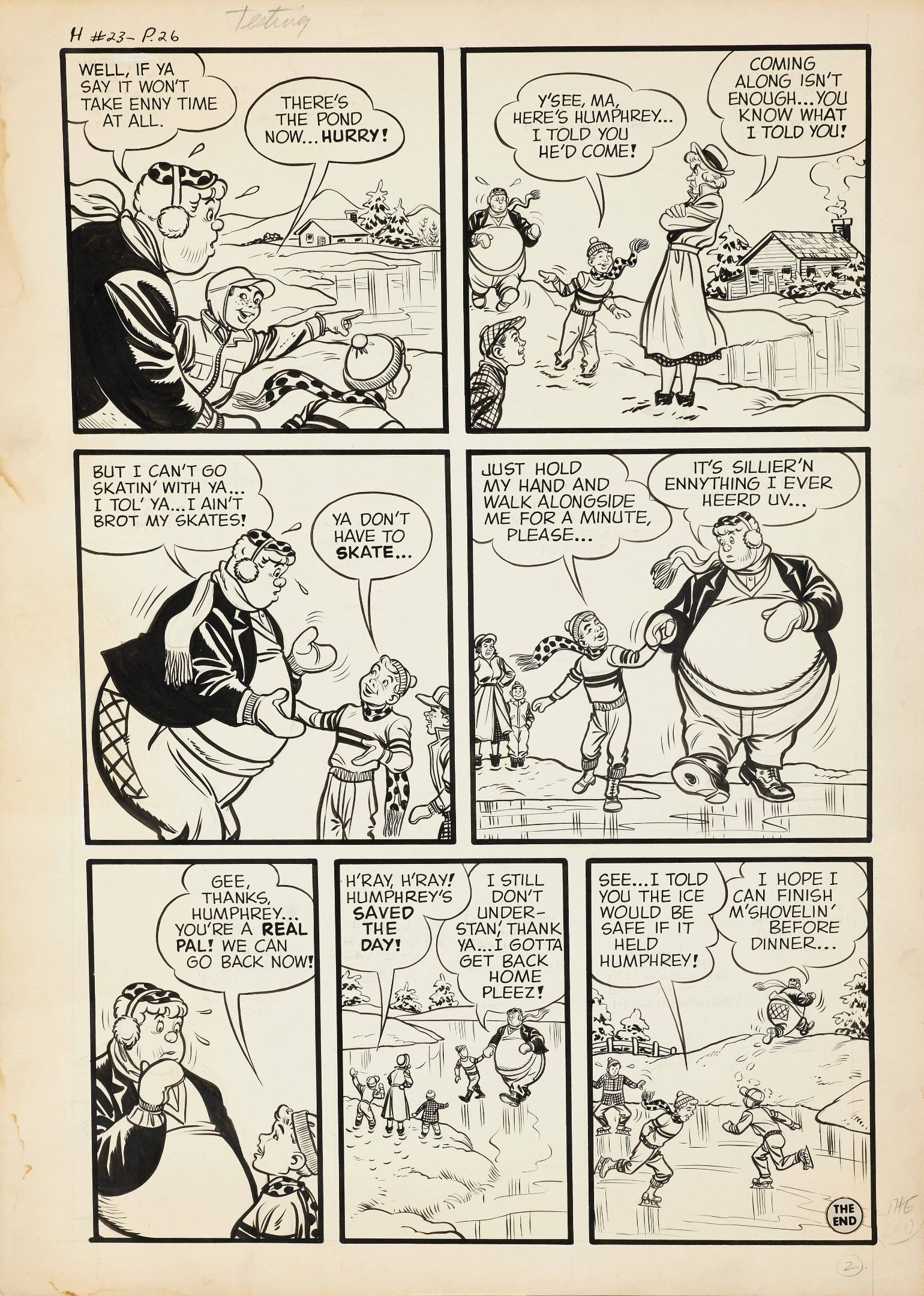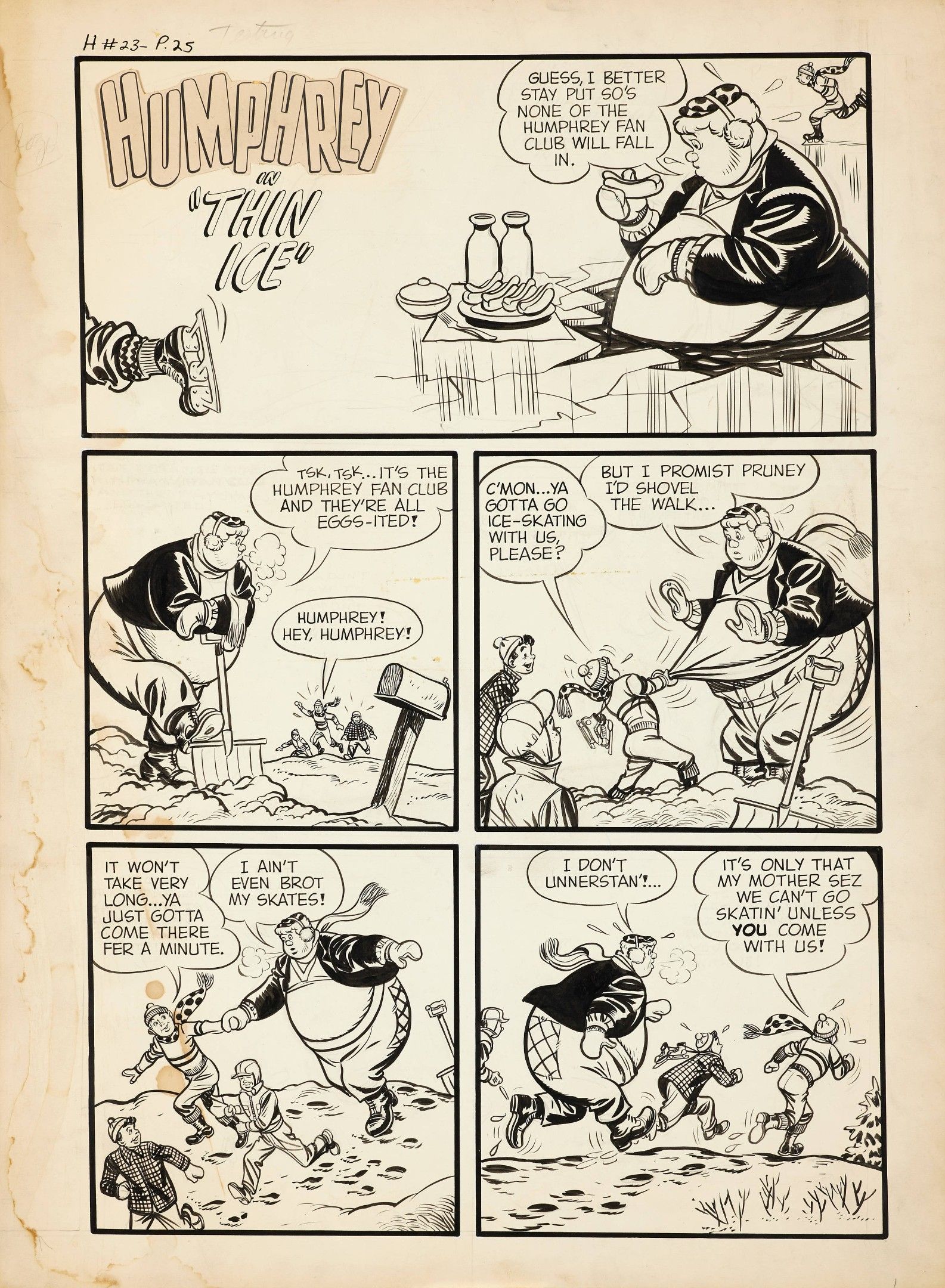 "Humphrey and his fan club. Circa 1952. Story planned for issue no. 23 of Humphrey Comics magazine, which was never published (the series, published by Harvey from 1948 to 1952, only ran for 22 issues). Handwritten annotations in Indian ink in the margin. Title pasted down. In the 1940s, Al Avison worked for Captain America Comics, Marvel Mystery Comics and Green Hornet Comics.