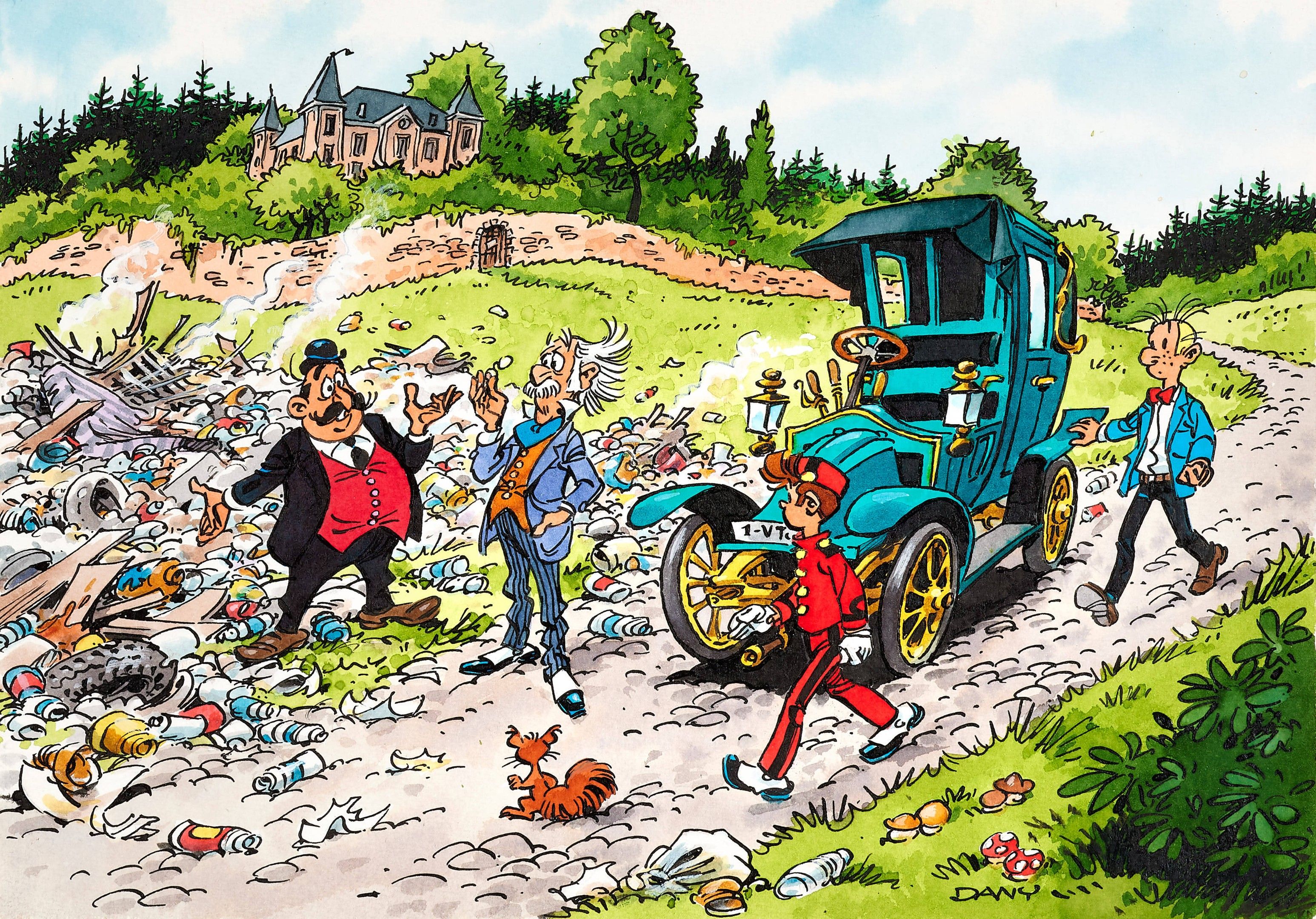 India ink, coloured inks and watercolour for an illustration depicting Spirou, Fantasio, the Count of Champignac and the mayor, and intended for an ex-libris accompanying a deluxe edition. Album published in 2023 by Dupuis.