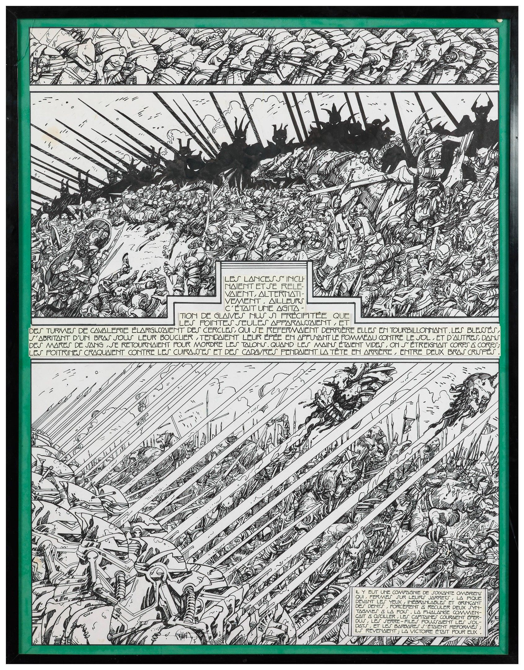 India ink and graphite for plate 17 of this album published in 1986 by Dargaud. Signed. Based on the work by Gustave Flaubert. The Carthaginian infantry and cavalry, supported by heavily armoured elephants, set out to meet the barbarian army, which soon had to face the terrible charge of these giant creatures. This is one of the best-known passages in the third part of Salammbô.
